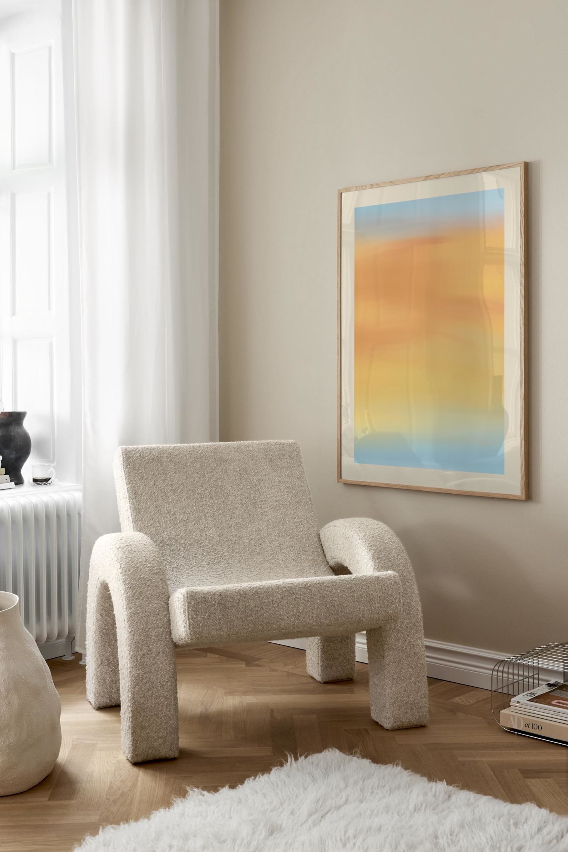 Miękkie gradienty bursztynu, ochry i błękitu nieba delikatnie poruszają się po powierzchni, sugerując mglisty popołudniowy nieboskłon. Wykończone lekką ramką, aby dopasować się do tonu.