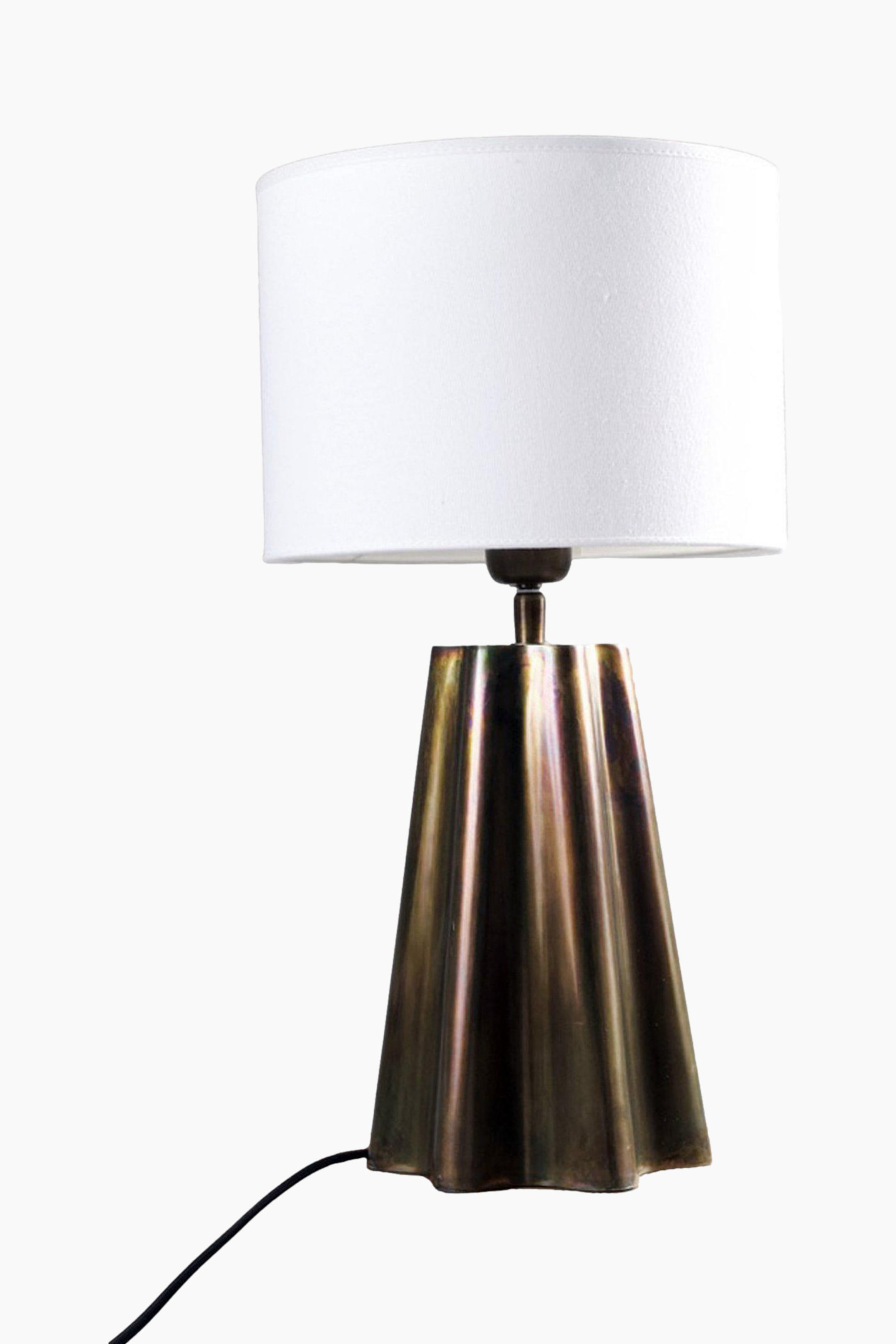 Podstawa lampy Aira z wykończeniem z olejowanego mosiądzu i białym cylindrycznym kloszem. Aira to podstawa lampy o organicznym, falistym kształcie wykonaną z metalu, łącząca styl rustykalny z nowoczesnym designem. Wykończenie jest ręcznie wykonywane i unikalne dla każdego egzemplarza. Olejowane wykończenie mosiądzu daje ciepły blask światła. Wysokość podstawy lampy to 34 cm, całkowita wysokość wraz z kloszem wynosi 50 cm, a średnica klosza to 25 cm. Czarny tekstylny przewód o długości 1,5 m. Regulowane gniazdo E27. Maksymalna moc 25W. Klasa ochrony IP20. Źródło światła nie jest w zestawie.