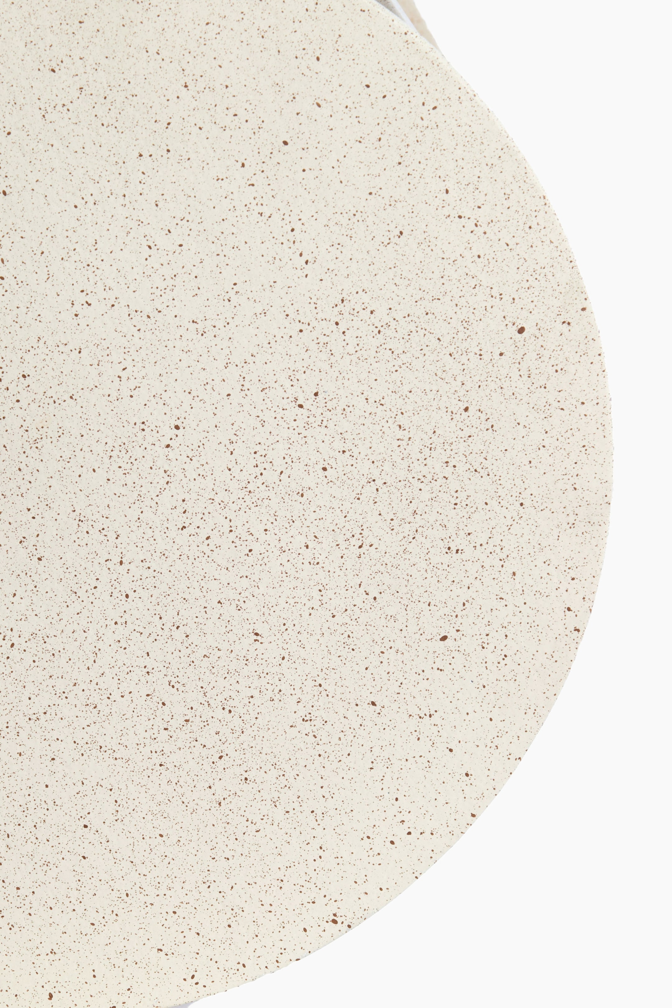 Stoliki boczne z serii Sadar emanują ciepłem i elegancją. Delikatny kolor piaskowy z jasnobrązowymi plamkami dodaje salonowi, sypialni lub przedpokojowi naturalnej i spokojnej atmosfery. Subtelna gra kolorów i matowy wygląd sprawiają, że stoliki przyciągają wzrok i doskonale pasują do różnych stylów wystroju wnętrza, od skandynawskiego i nowoczesnego po boho. Zestaw składa się z dwóch stolików o różnych wysokościach i średnicach (śr. 50 x 40 cm i śr. 52 x 46 cm). Możesz umieścić je razem jako stolik kawowy lub używać ich oddzielnie obok sofy albo łóżka. Wytrzymały metalowy materiał jest solidny i ma wyrafinowaną teksturę, którą nie zawsze dobrze widać na zdjęciu, ale wygląda wyjątkowo luksusowo w rzeczywistości. Postaw na nim ładny wazon, Wymiary: 52 x 52 x 46