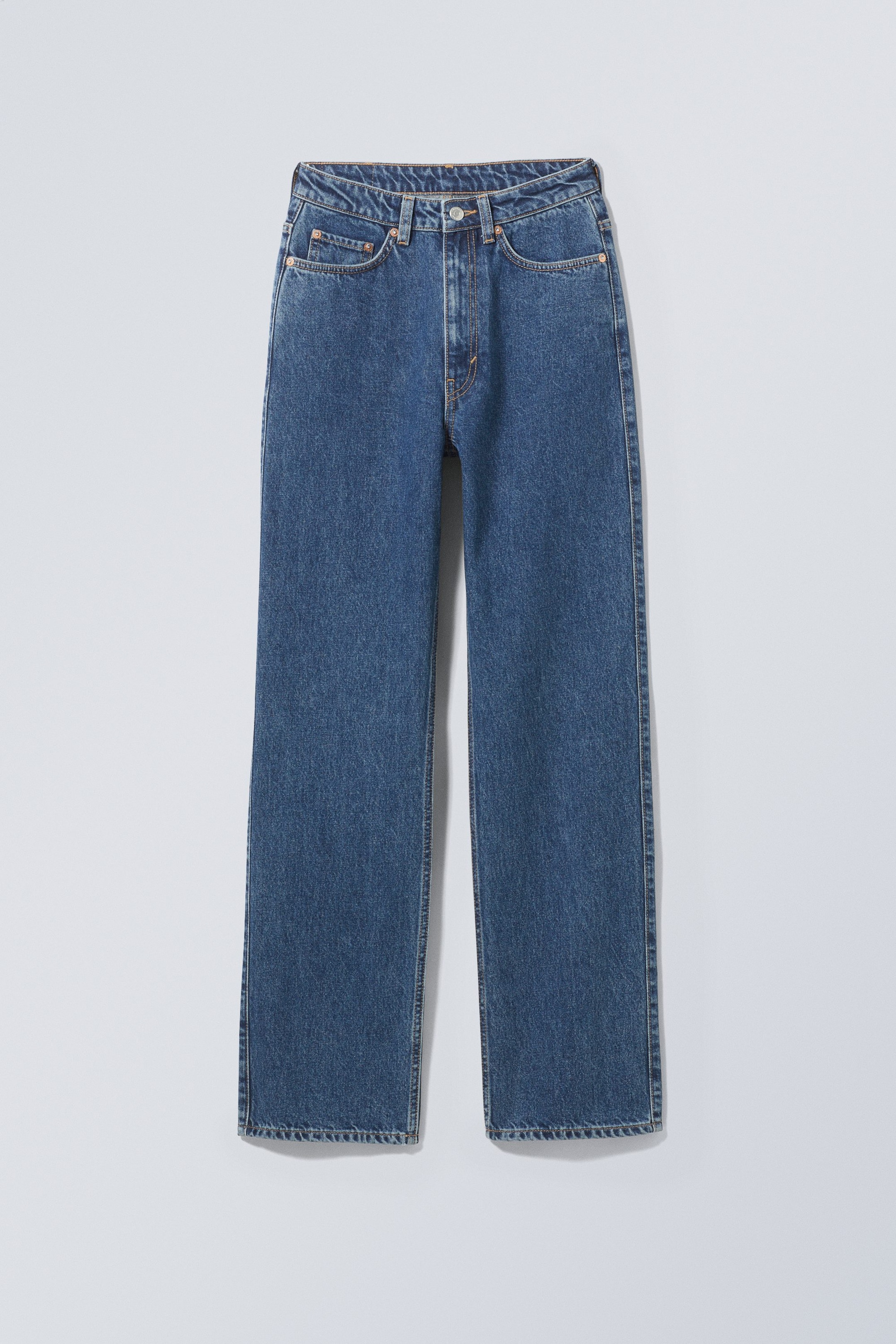 Par de calças de ganga de cintura super subida com um corte regular, perna direita e comprimento longo. Estas calças de ganga são confecionadas em ganga rígida de algodão orgânico reforçada com algodão reciclado. Apresentam um design clássico de 5 bolsos e uma braguilha com botões.