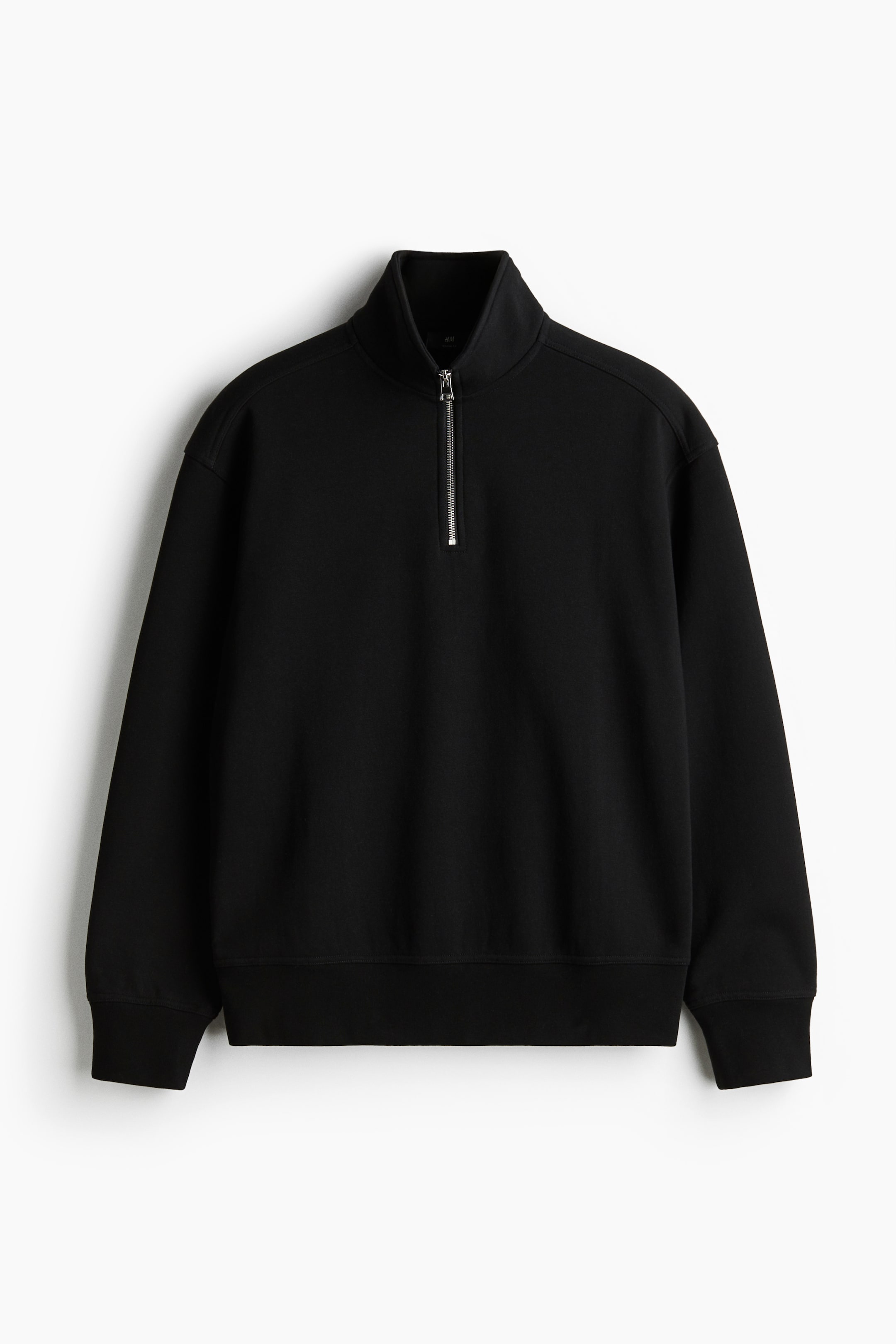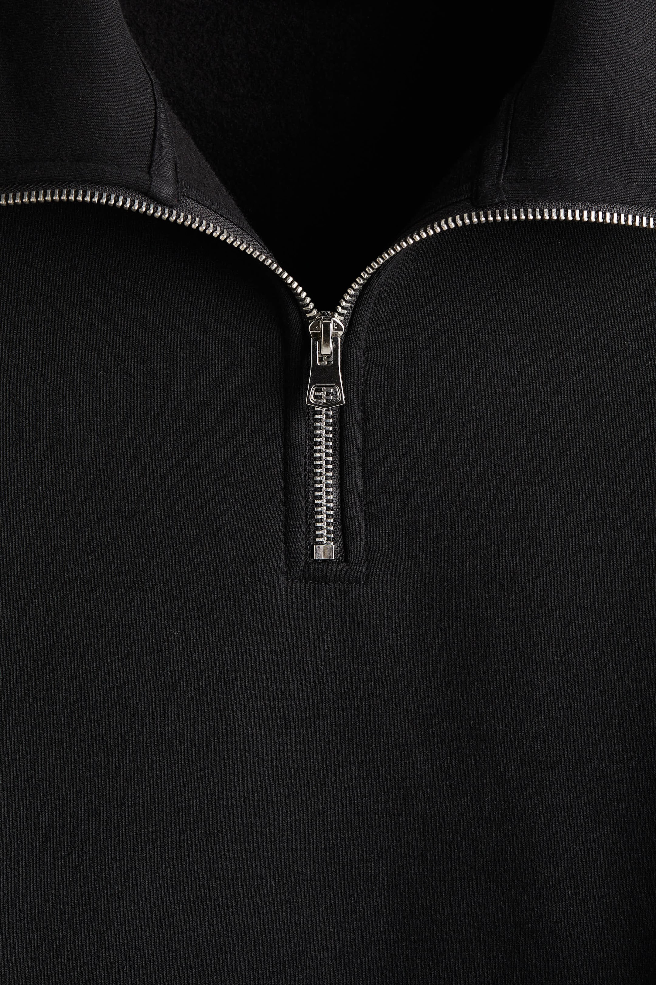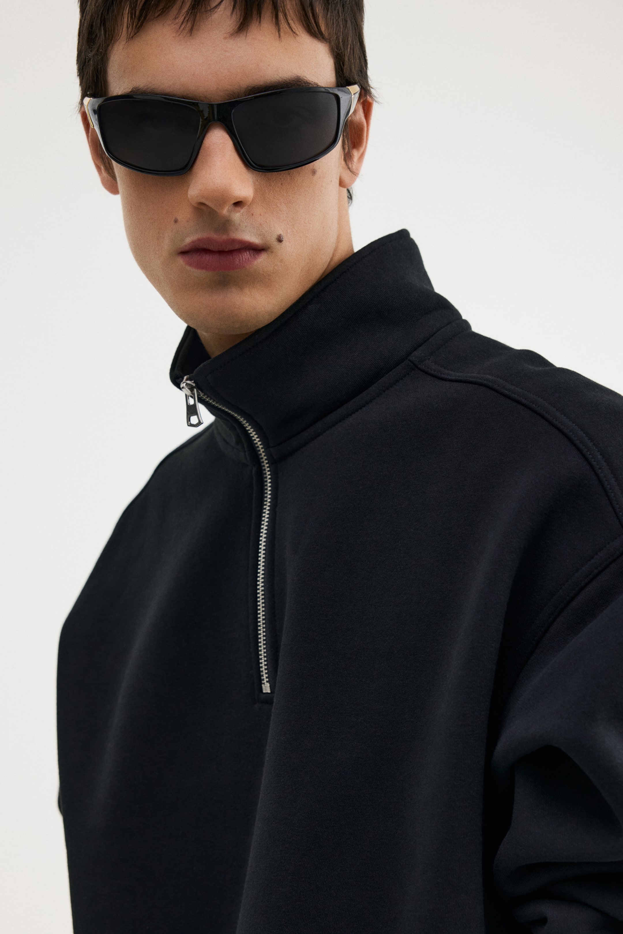 Sweatshirt em tecido moletão pesado de mistura de algodão com o interior cardado e macio. Gola subida e fecho éclair na parte superior. Encaixe nas costas, ombros descaídos e mangas compridas. Punhos e cós canelados. Corte solto para uma silhueta generosa mas não oversize.