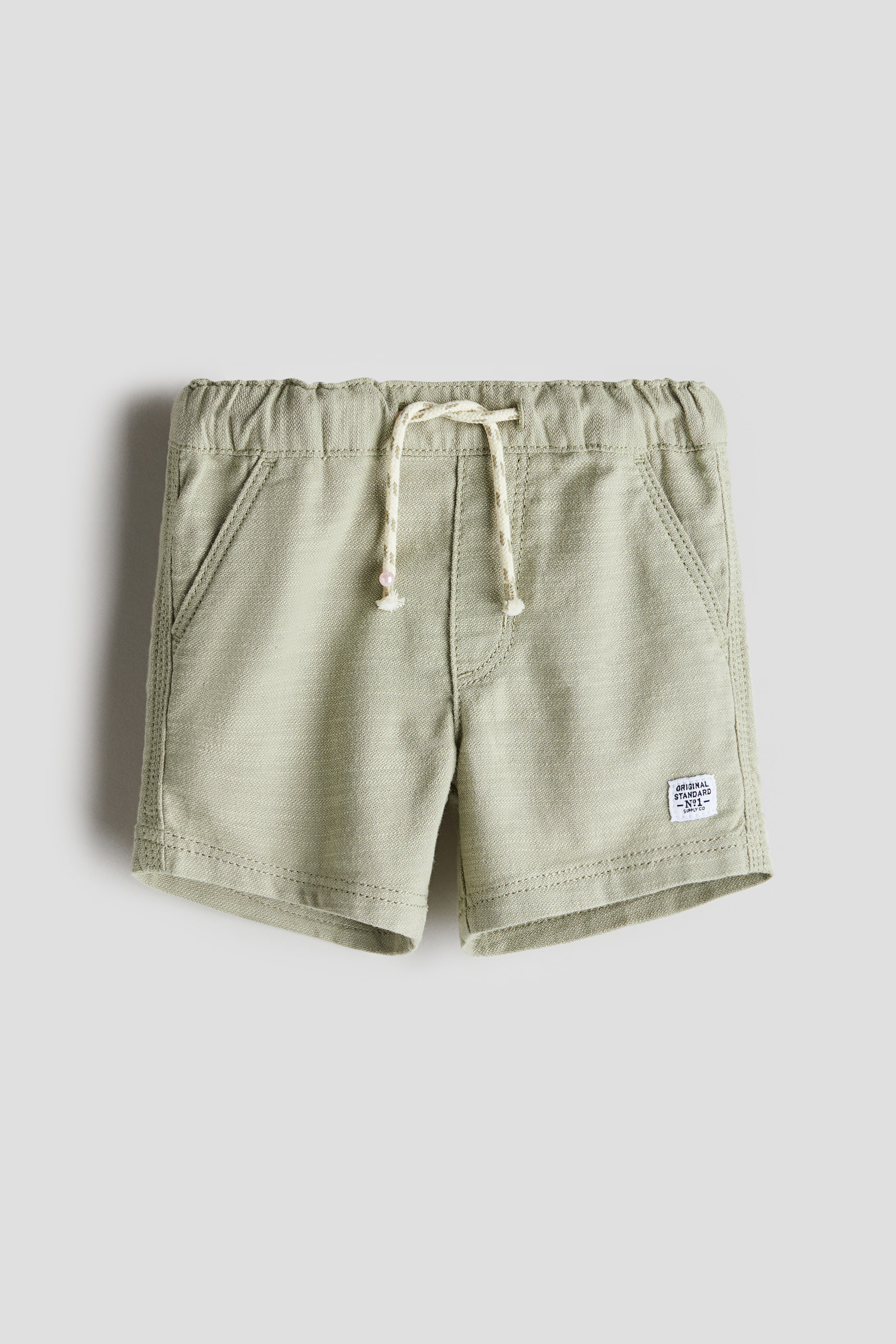 Calções em sarja macia com bolsos dianteiros decorativos e elástico ajustável e cordão de ajuste na cintura. Braguilha falsa.