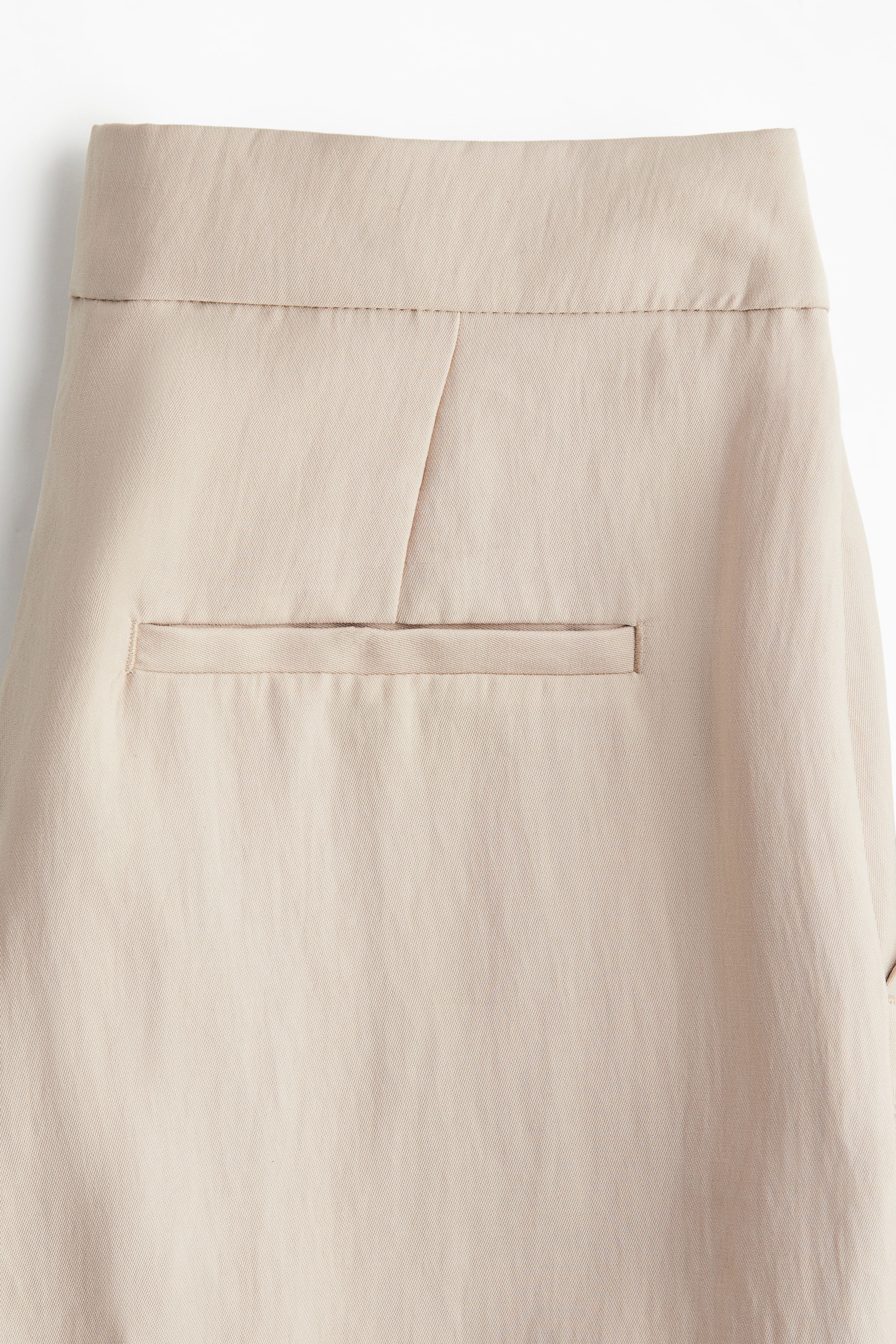 Calças de estilo clássico em sarja num modelo de corte solto com cintura alta e braguilha com fecho éclair e botão. Bolsos laterais enviesados e bolsos traseiros embutidos. Pernas largas com vincos à frente e atrás.
