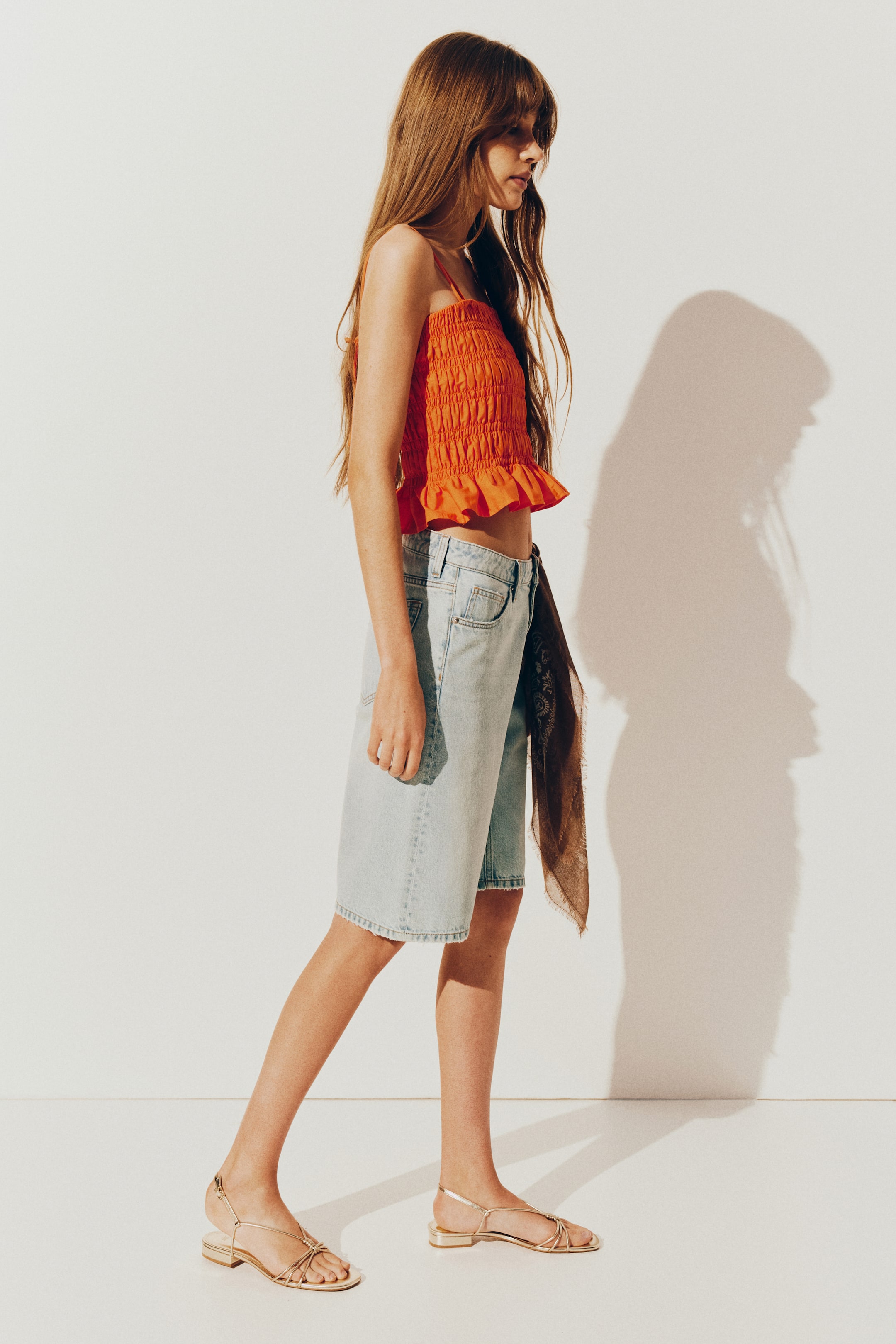 Top justo em tecido de algodão com franzido smock. Modelo com decote reto e orla de folho em baixo. Alças duplas finas que passam através de pequenas aselhas e atam nas costas.