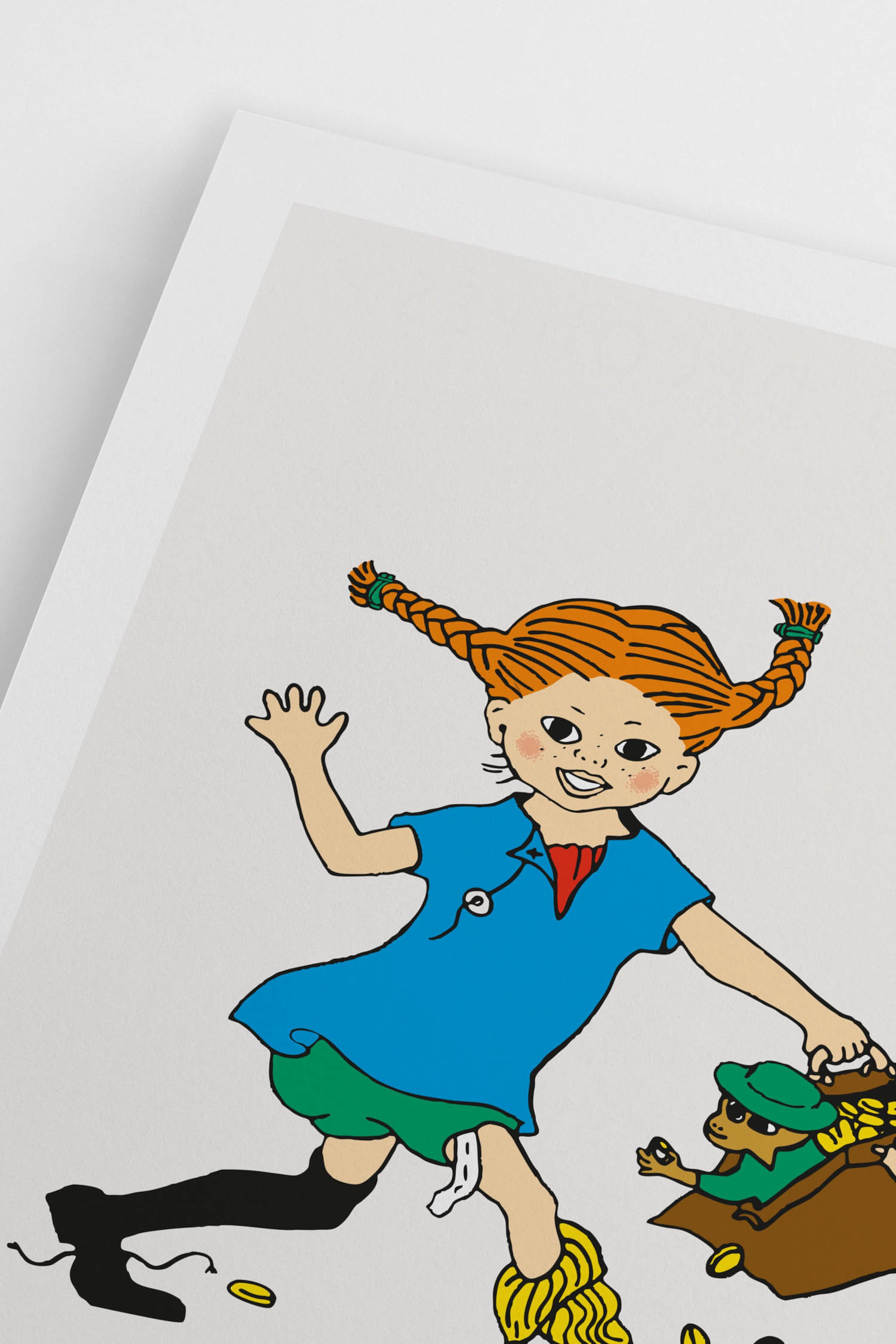 Píppi Meialonga é uma personagem atemporal criada pela autora sueca Astrid Lindgren. Com sua bondade, tranças laranjas, rosto sardento e força notável, Píppi vive uma vida cheia de aventuras em Villa Villekulla, acompanhada por seu cavalo, Lúcia Maluca, e macaco, Sr. Nilson. Desde 1945, Píppi conquistou os corações dos leitores em todo o mundo, tornando-se um símbolo amado de liberdade, força e o não convencional. As imagens são ilustradas por Ingrid Vang Nyman. Uma ilustração de Píppi Meialonga andando com sua mala cheia de moedas, com seu macaco, Sr. Nilson, descansando dentro. Uma citação de Píppi está escrita em inglês abaixo da imagem. O motivo é definido contra um fundo retangular bege e emoldurado com um passepartout branco embutido.