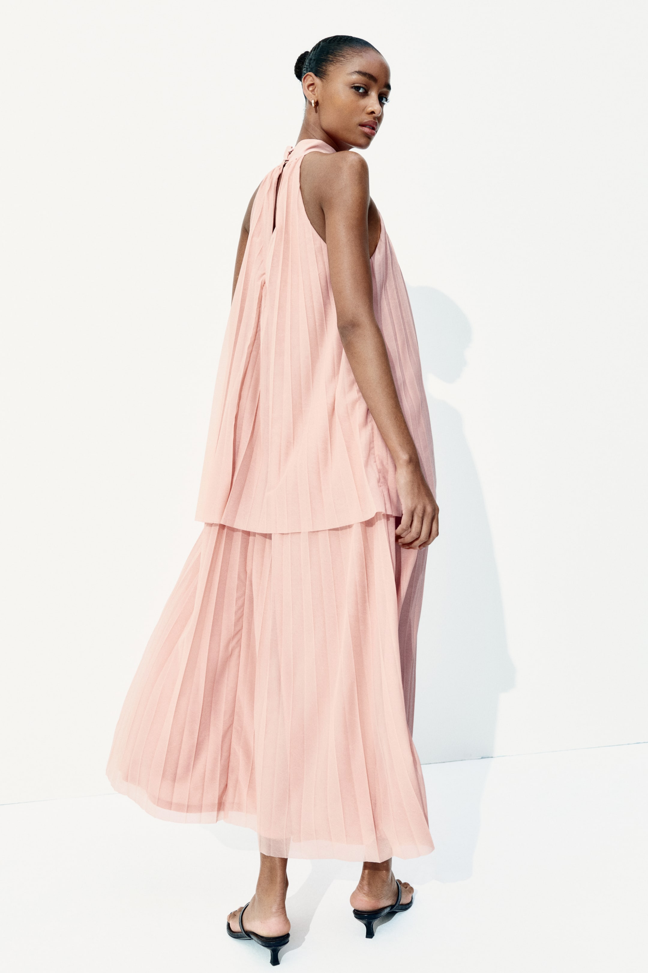 Vestido sem mangas pelo tornozelo confecionado em jersey plissado com efeito de sobreposição. Modelo com gola subida e pequena abertura com botões forrados nas costas. Forrado.