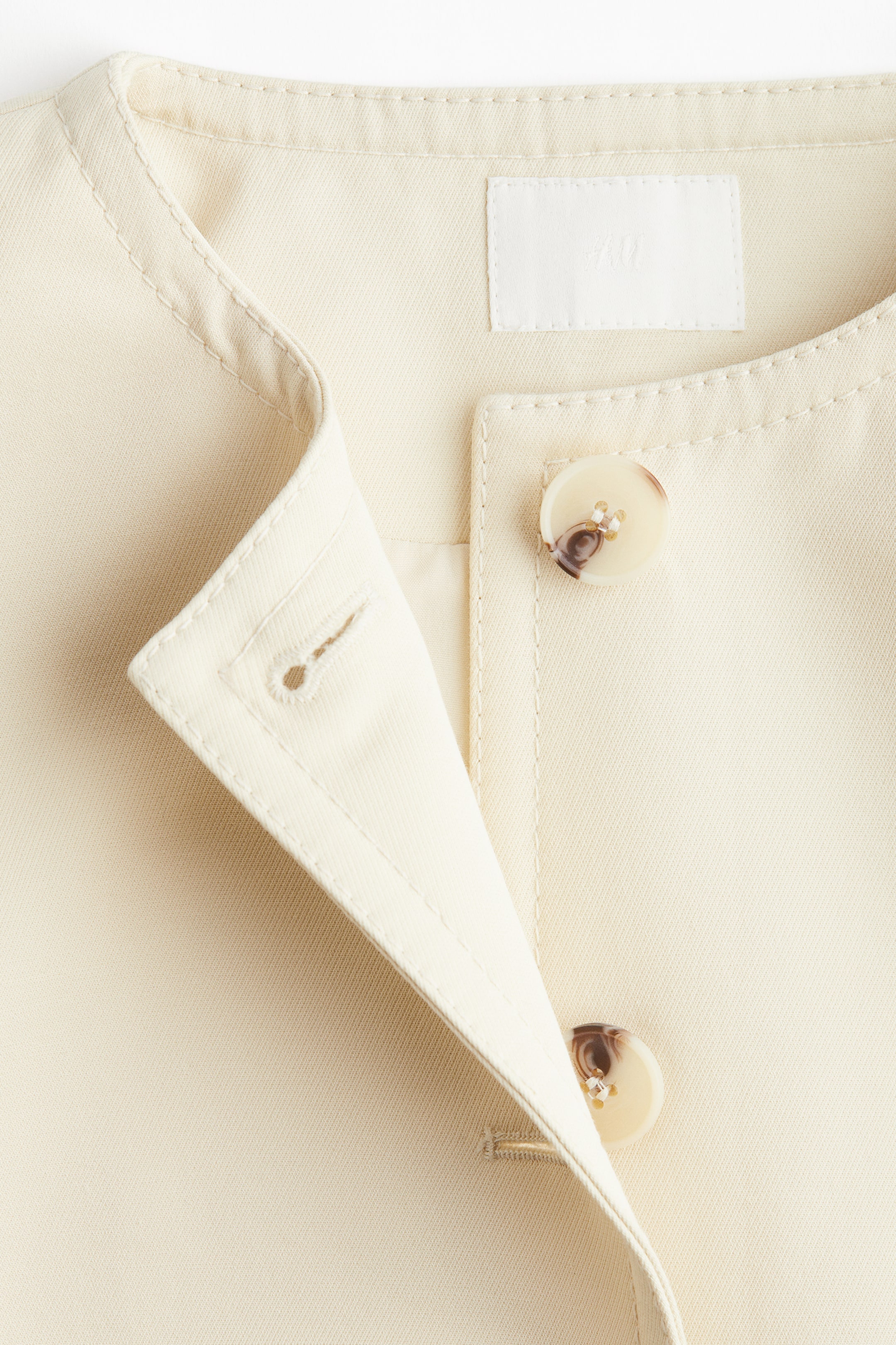 Casaco justo em tecido com decote redondo e botões até à cintura. Bolsos frontais aplicados e pinças modeladoras na cintura para uma silhueta cingida. Chumaços nos ombros e mangas com fenda nos punhos. Forrado.