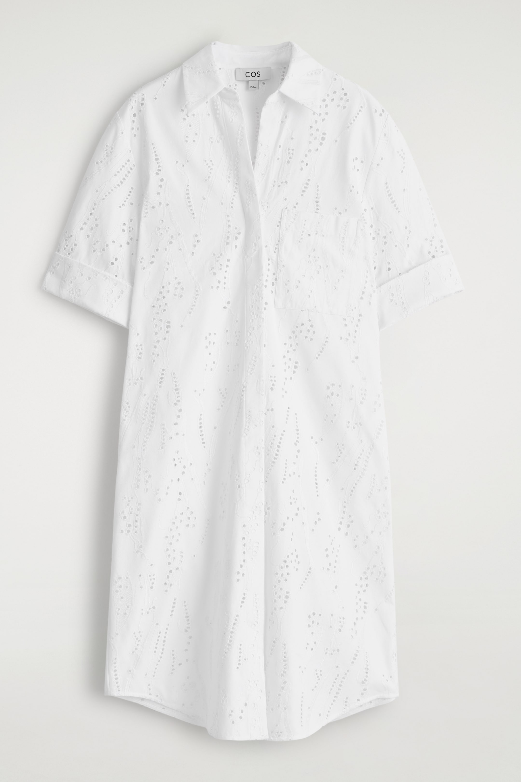 O detalhe em broderie anglaise renova o vestido camisa clássico com uma feminilidade moderna. Confeccionado em algodão orgânico, apresenta um tom branco suave com bordados tonais intrincados e é desenhado com gola pontiaguda, bainha curva e mangas curtas. Corte regular Fecho de botões Algodão orgânico é algodão cultivado sem o uso de pesticidas ou fertilizantes artificiais e não contém organismos geneticamente modificados Material exterior: 100% algodão orgânico. Excluindo adornos / Lavagem à máquina Comprimento nas costas do tamanho EU 36 é 97,2 cm / Modelo usa tamanho EU 36