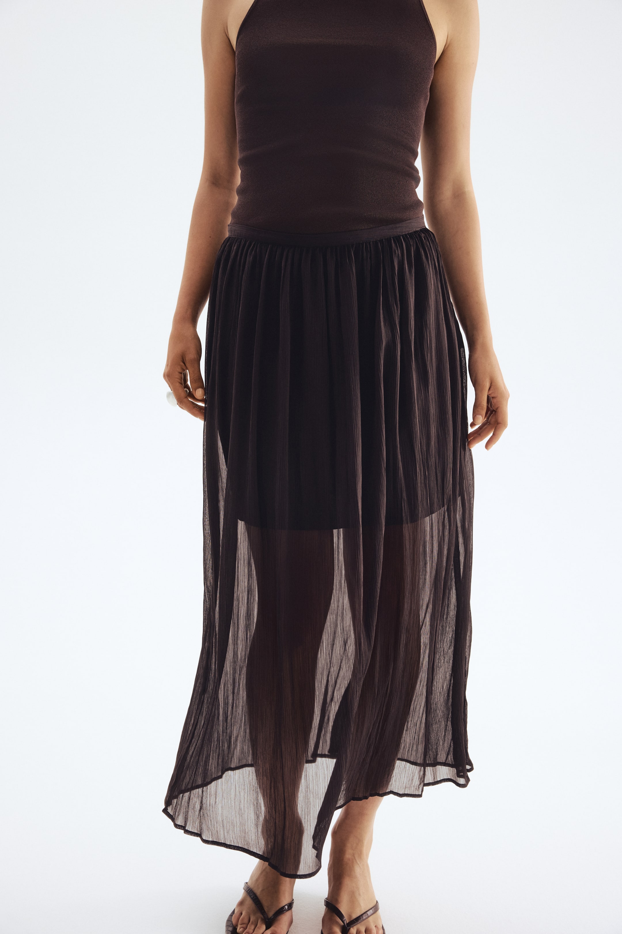 Saia pelo meio da perna em tecido translúcido enrugado com cintura elástica alta e fecho éclair oculto num dos lados. Saia interior curta.