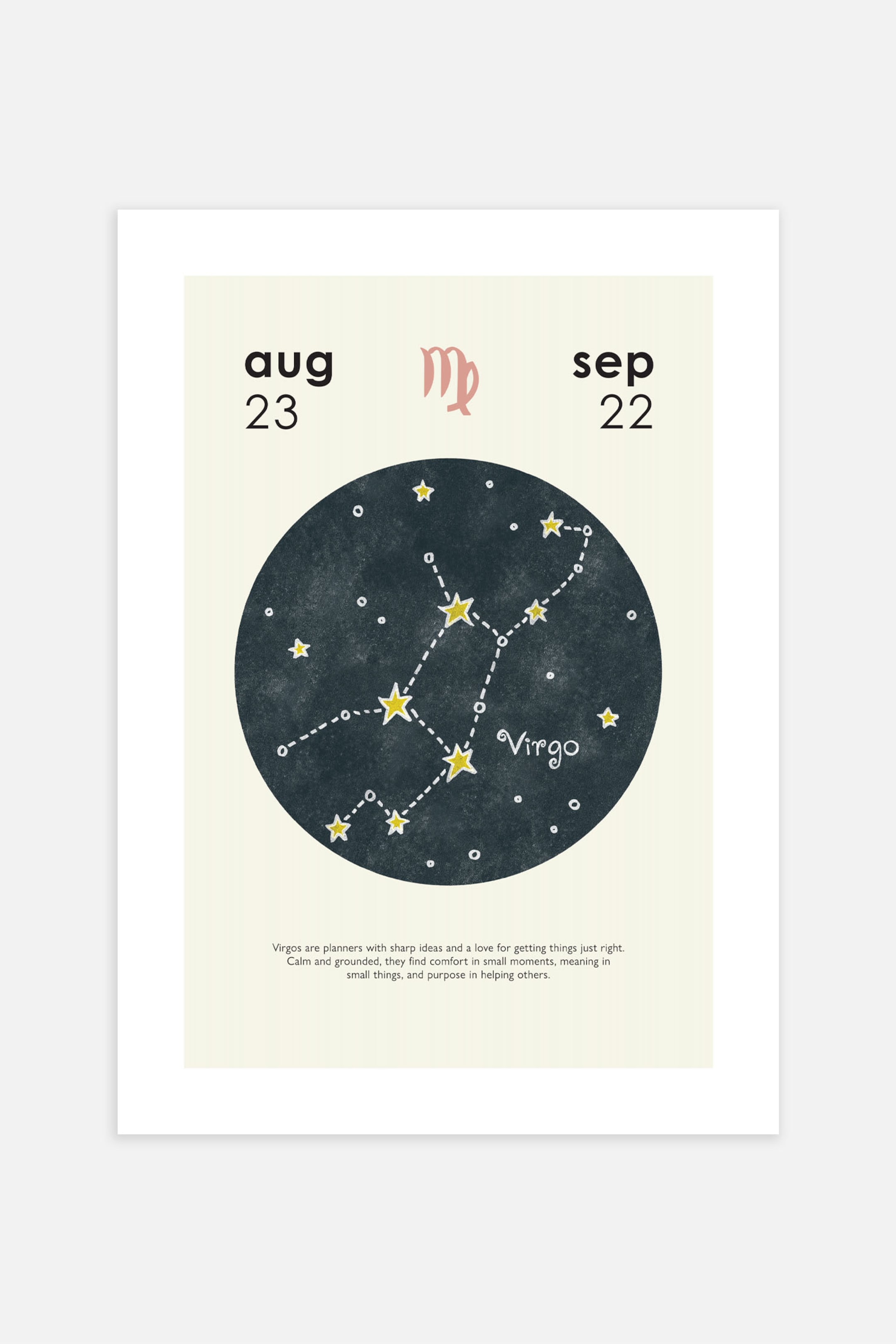 A Virgo constellation drawn with white and yellow pencils in a childish cartoon style on a textured background. With artwork by artist Iuliia Tkachova, the poster also shows the zodiac dates and symbol at the top. Zodiac traits are written at the bottom for a playful, personal touch. A built-in white border frames the motif elegantly.
