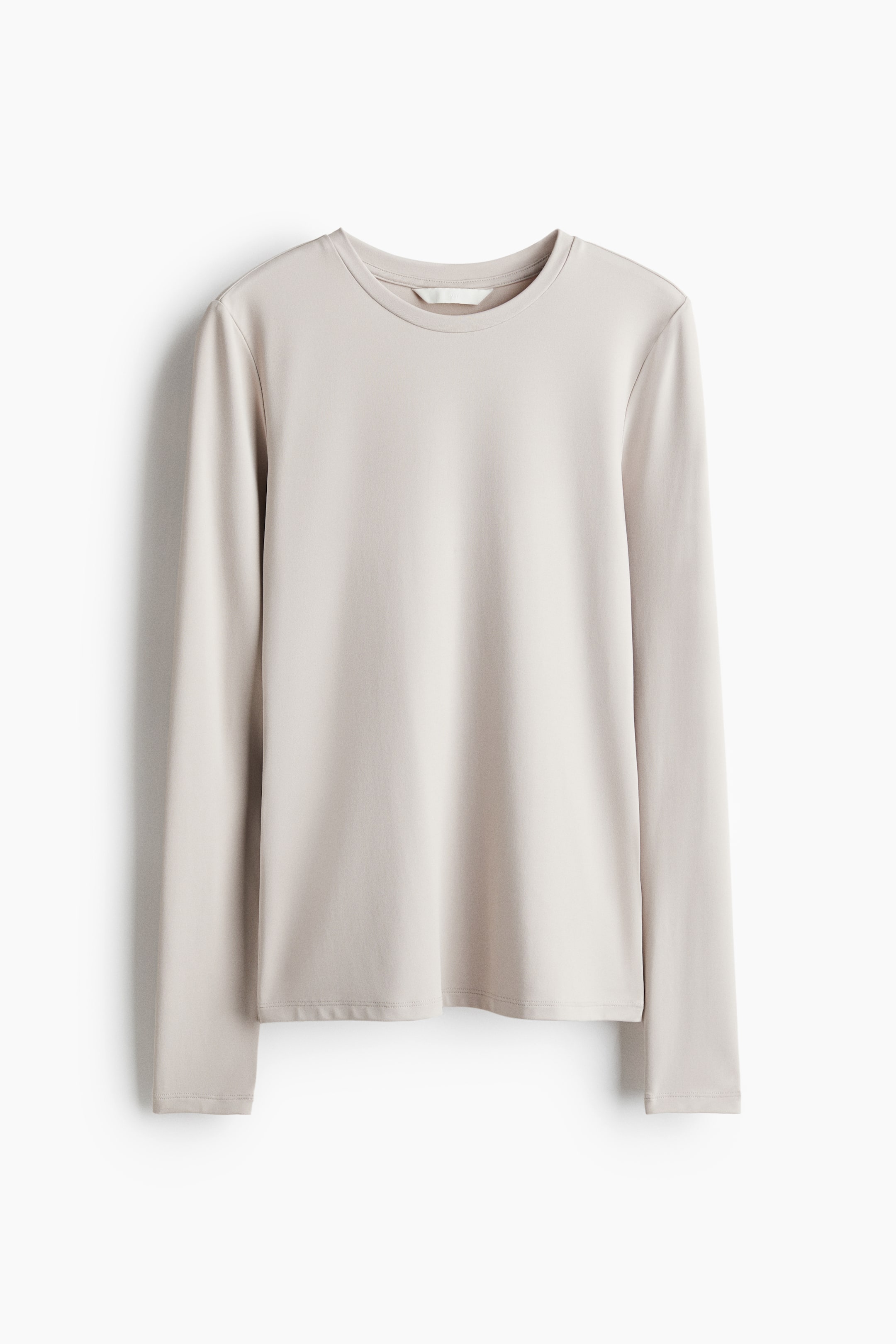 Bluză ajustată pe corp, din jerseu moale, cu decolteu rotund și cu mâneci lungi. Bordură îngustă la răscroiala gâtului.