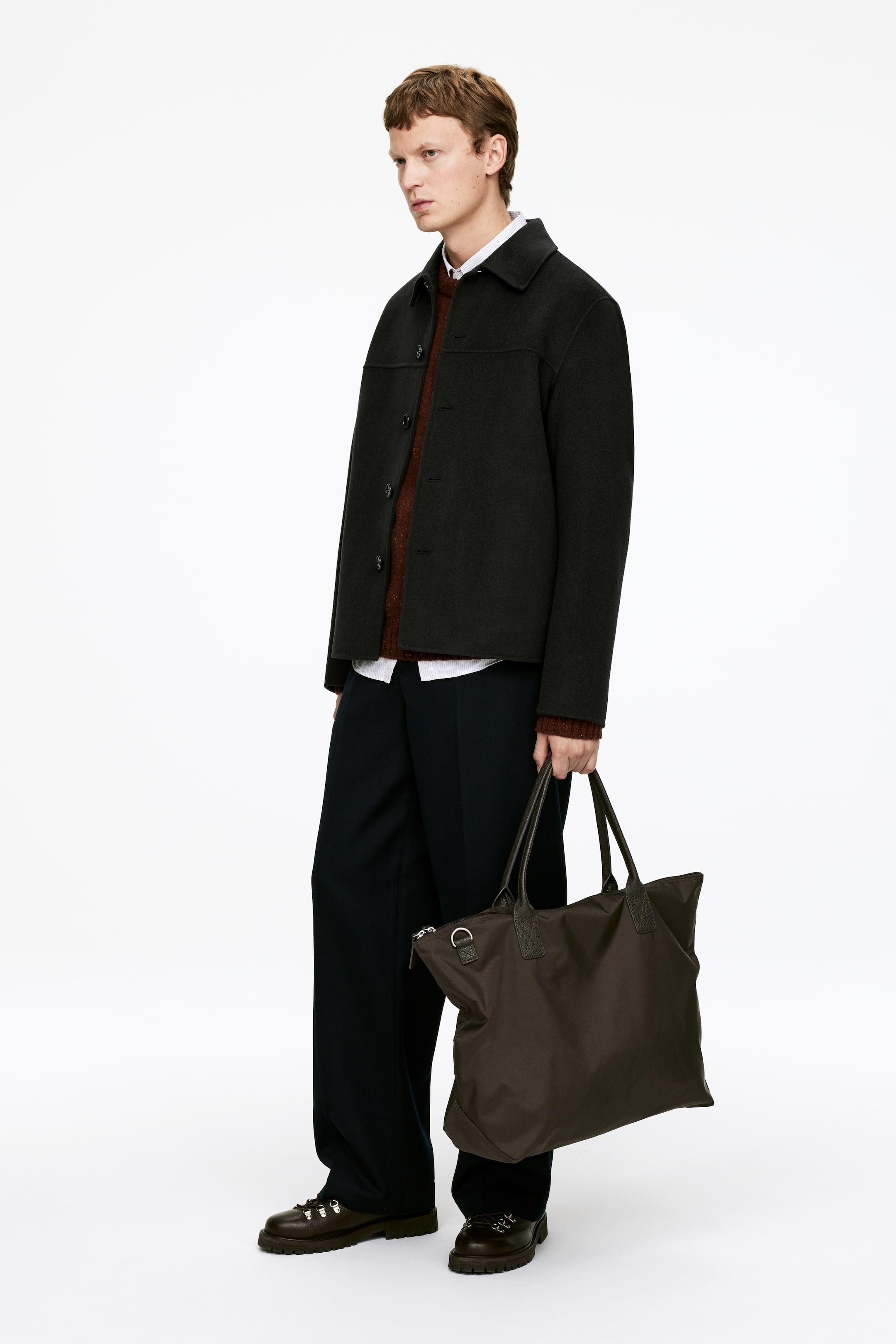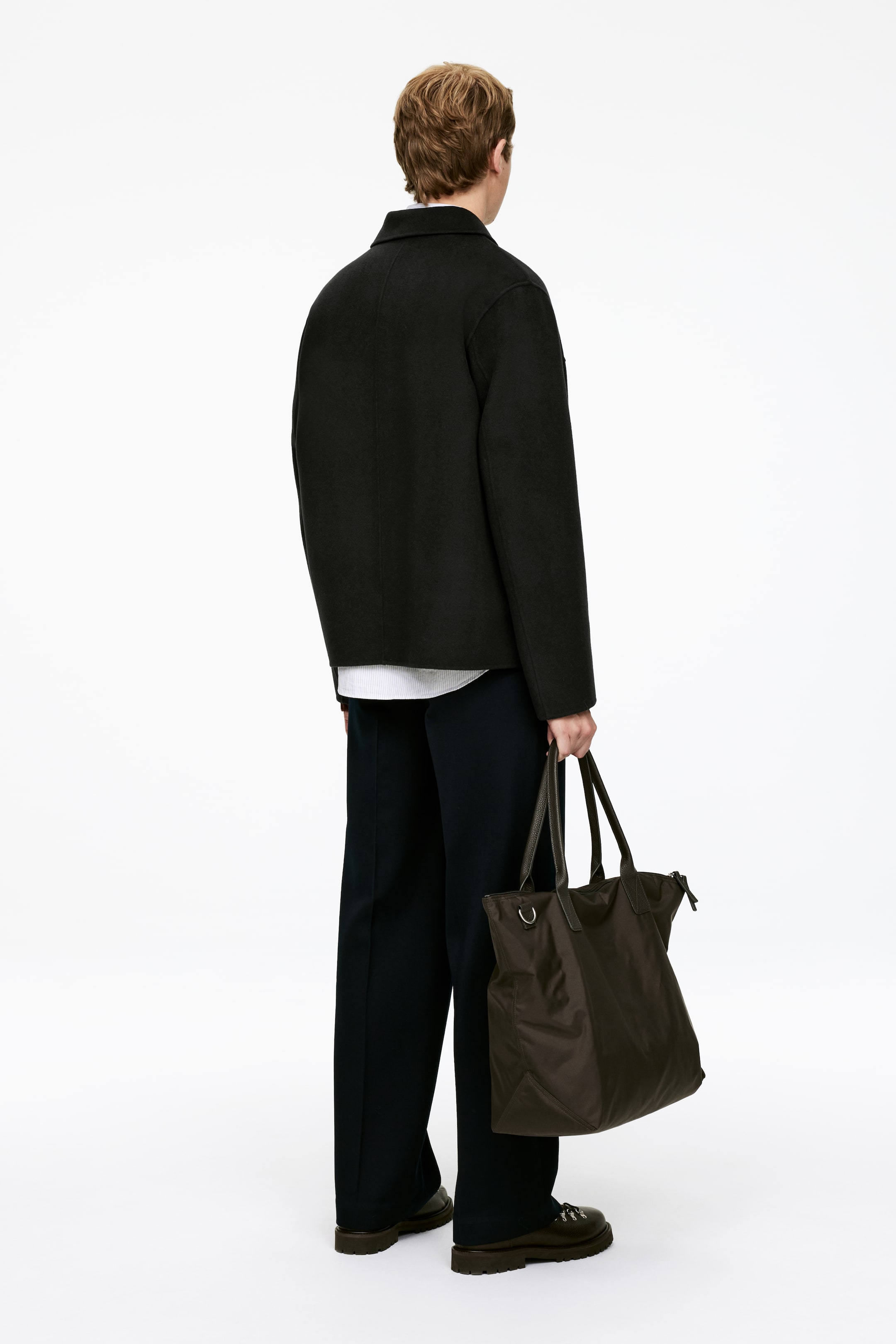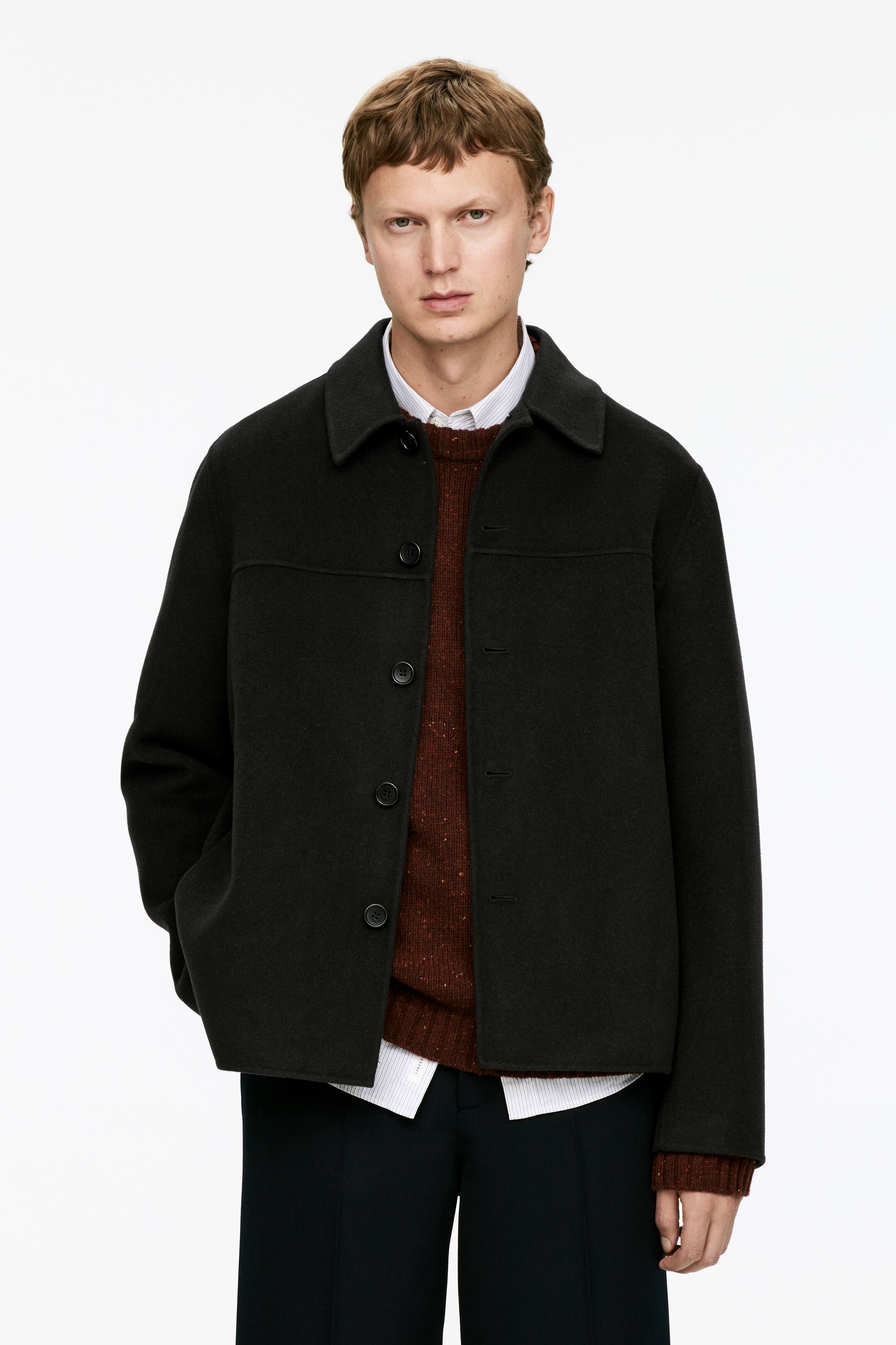 Jachetă scurtă din țesătură de lână doublé. Închidere cu nasturi din corozo și buzunare în cusăturile laterale. Mâneci căptușite. Croială lejeră.