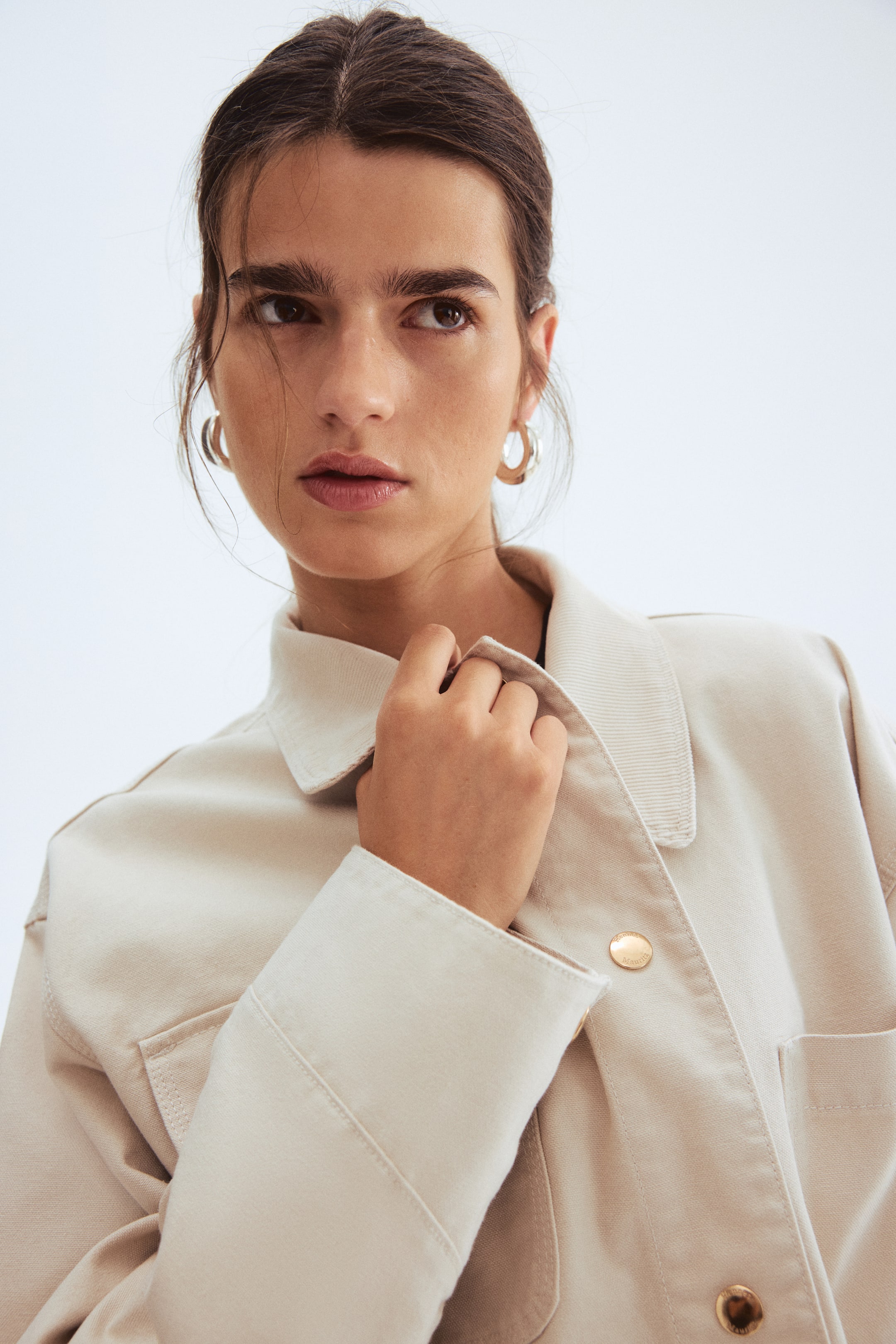 Jachetă din țesătură oxford de bumbac, cu guler din catifea reiată. Capse și patru buzunare aplicate în față, dintre care unul cu clapă și capsă. Mâneci lungi cu capsă la manșete.