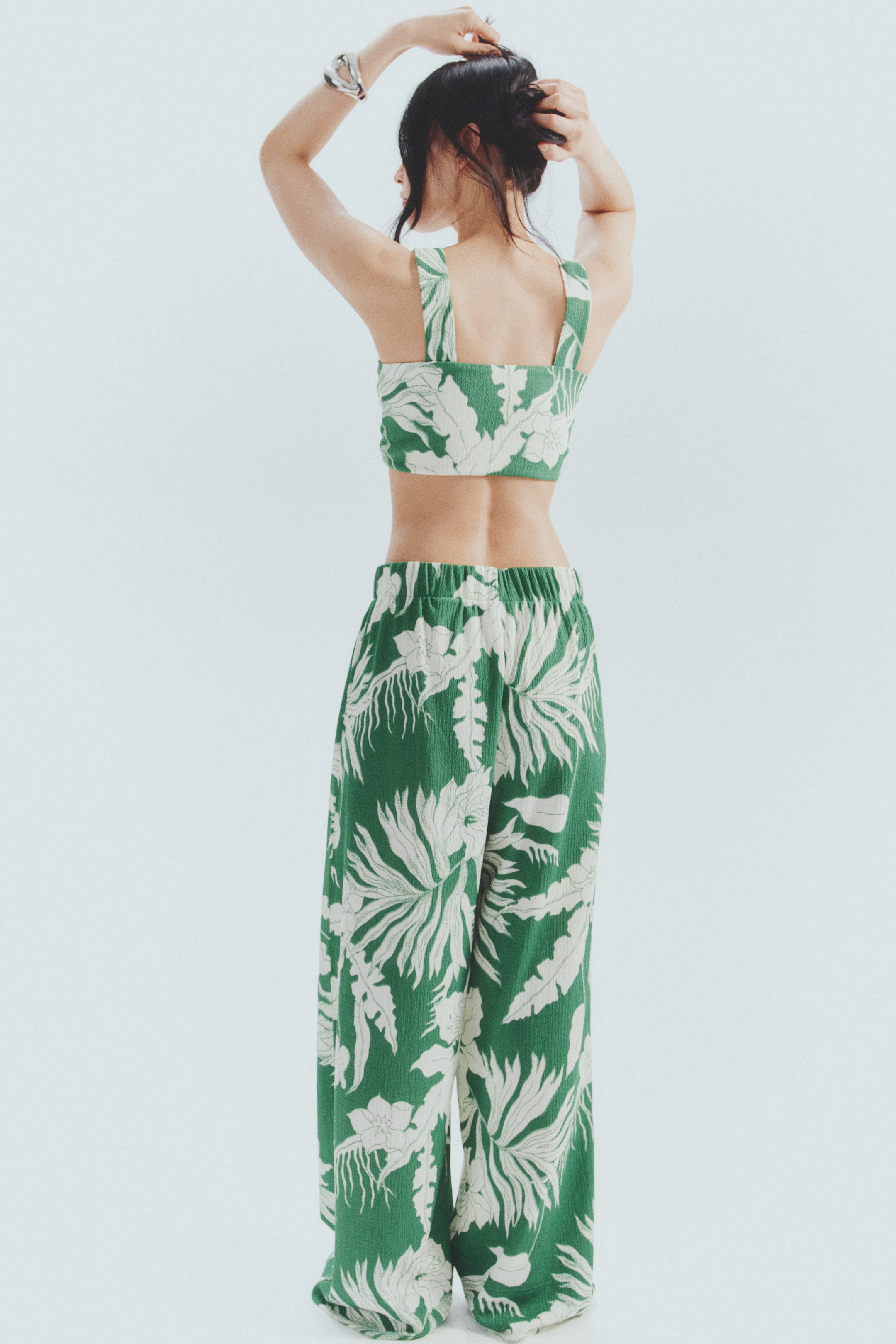 Pantaloni cu croială lejeră, din jerseu, cu talie înaltă cu elastic. Model larg pe picioare.