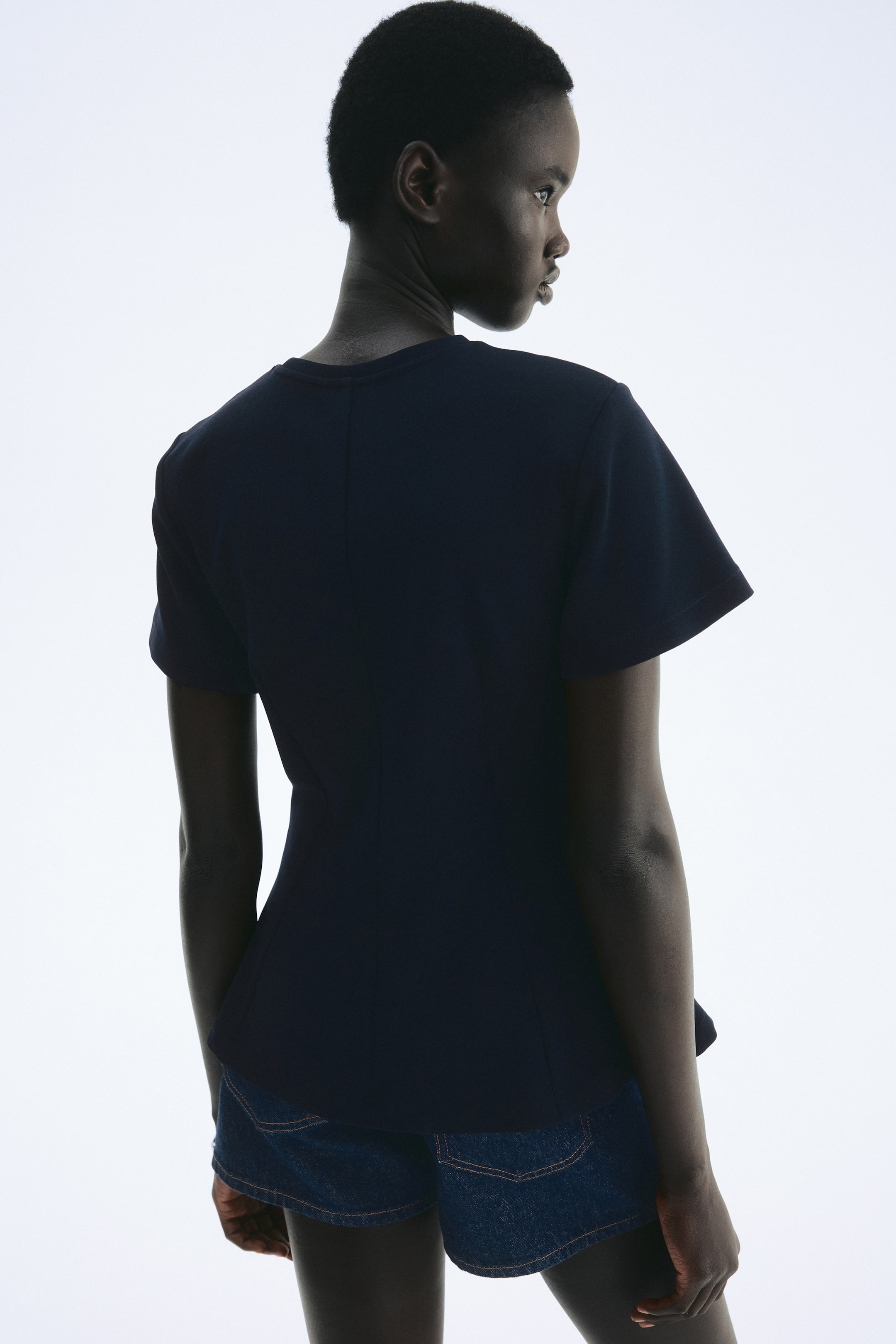 Bluză ajustată pe corp, din jerseu interlock gros, cu decolteu rotund și cu mâneci scurte. Pense modelatoare în talie și croială evazată la bază.