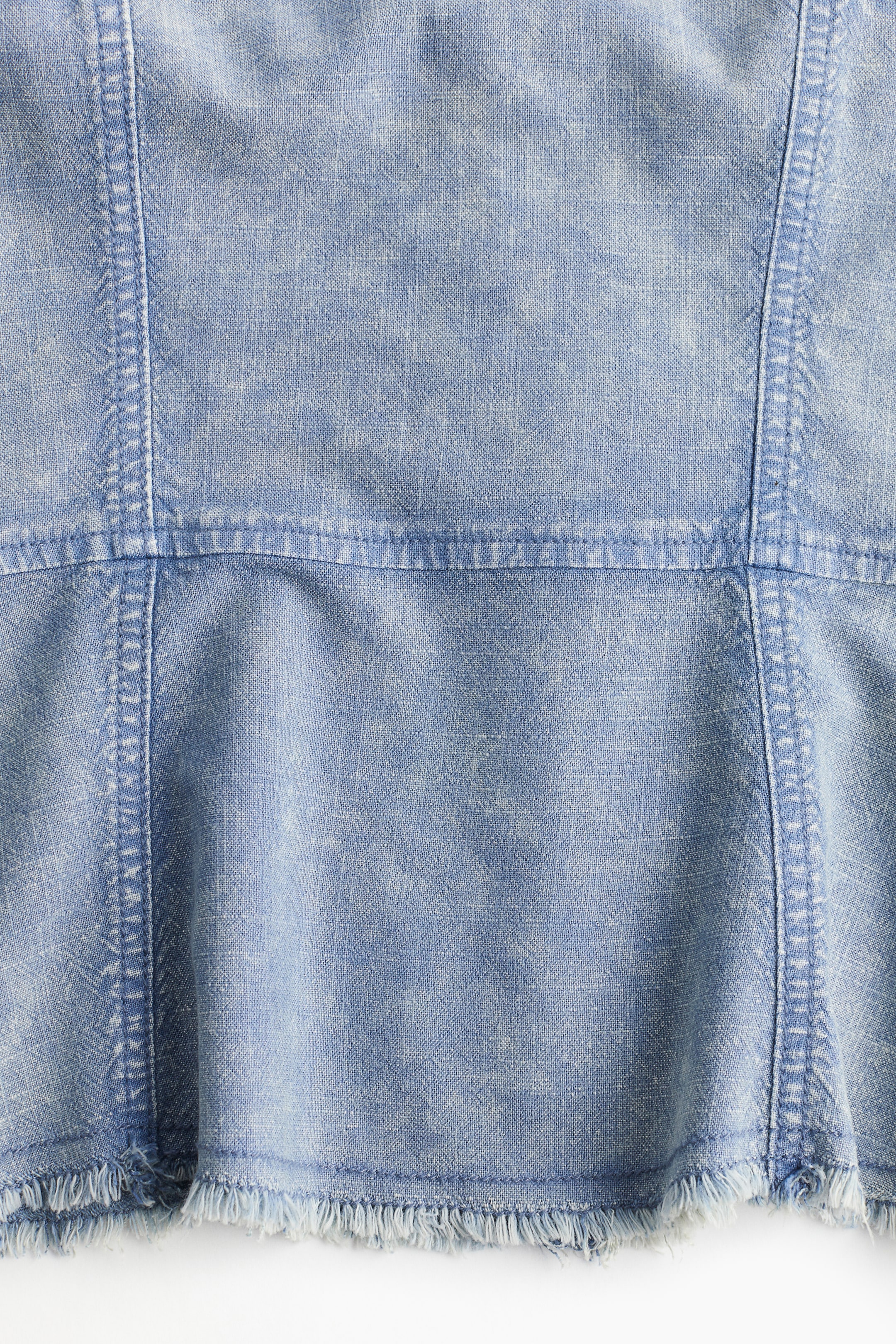 Vyblednuté tielko z tkanej zmesi bavlny a viskózy. Hranatý výstrih a tenké nastaviteľné ramienka. Viditeľné švy vpredu aj vzadu, skrytý zips na chrbte a mierne rozšírený volán naspodku. Rozstrapkané okraje na spodnom leme.