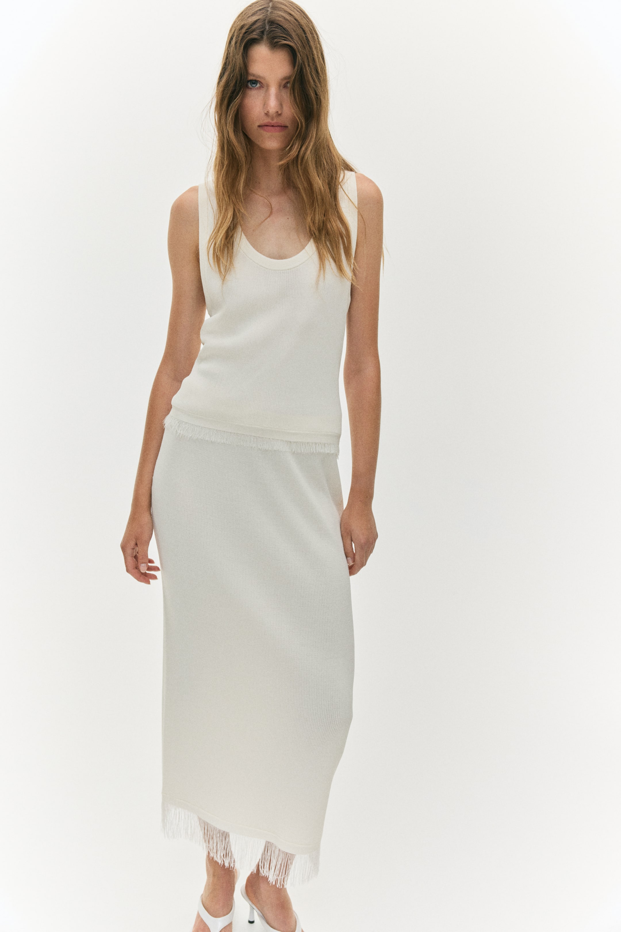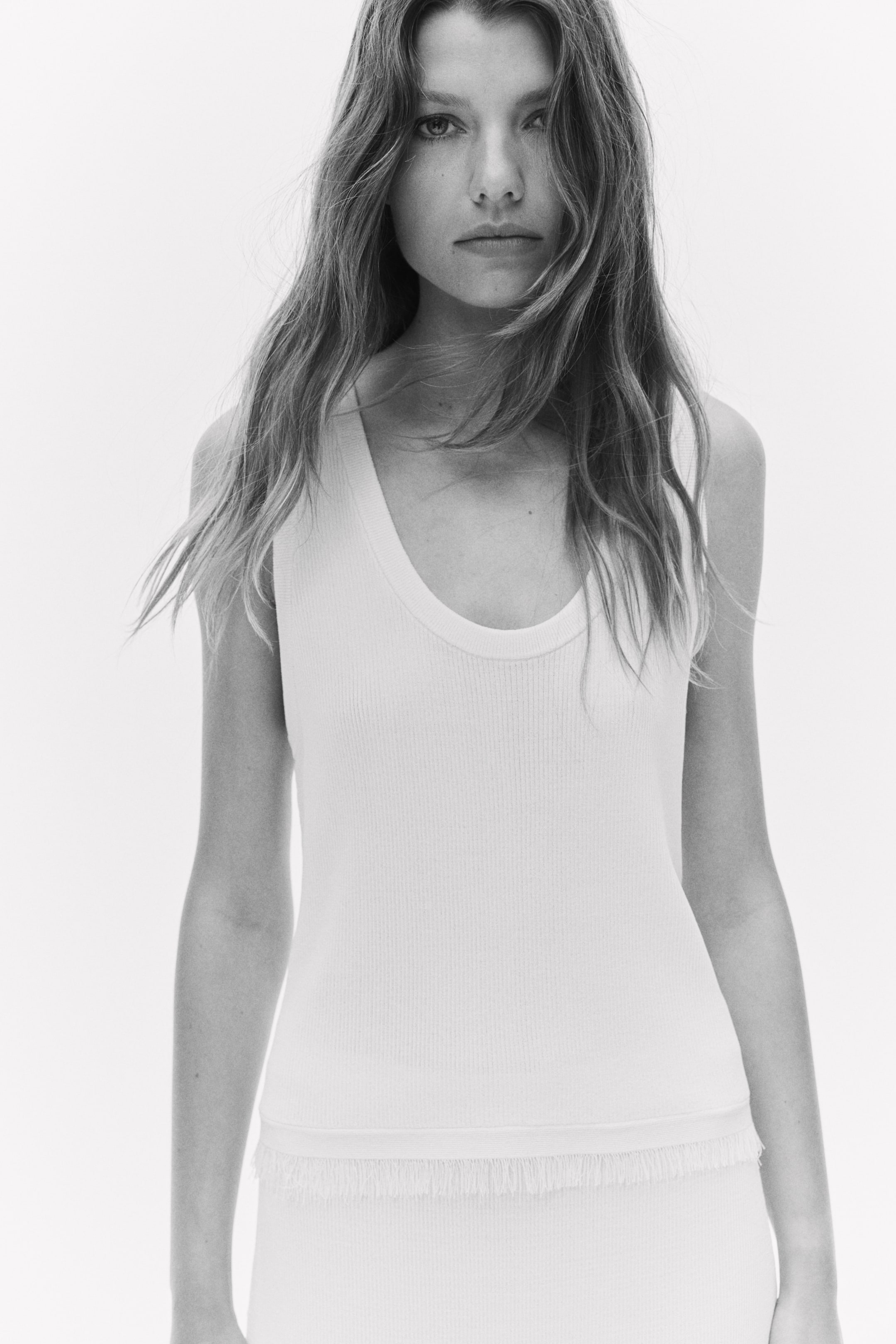 Krátke priliehavé tielko z rebrovaného úpletu s oválnym výstrihom a rozstrapkaným spodným okrajom.