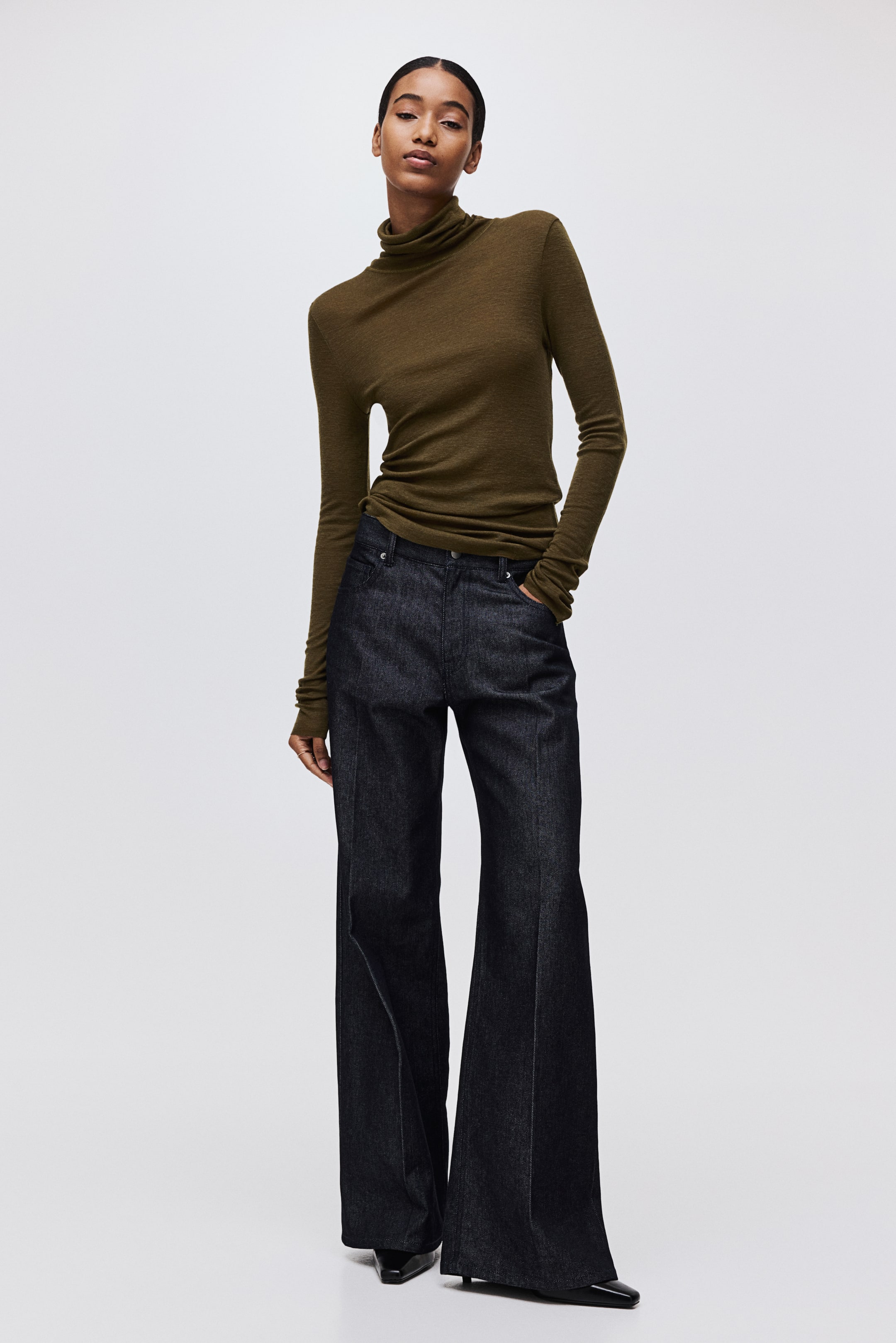 Pulóver z mäkkého rebrovaného vlneného úpletu s rolákovým golierom a dlhými rukávmi.