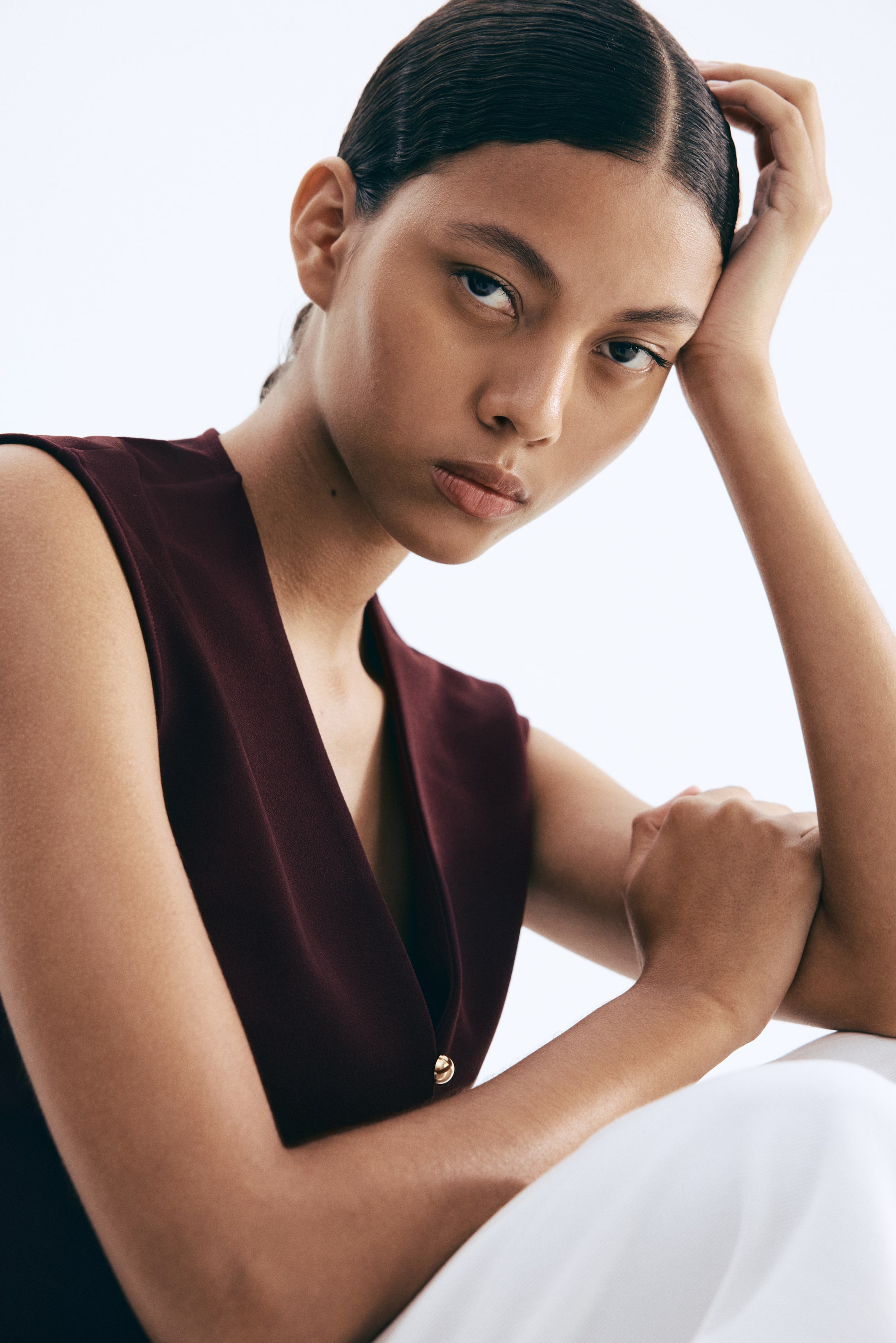 Priliehavá vesta z pevného interlockového džerseja s pristrihnutými rukávmi, hlbokým véčkovým výstrihom a zapínaním na malé kovové gombíky po pás, čím sa vytvára jemne rozšírený strih od pása smerom dole.