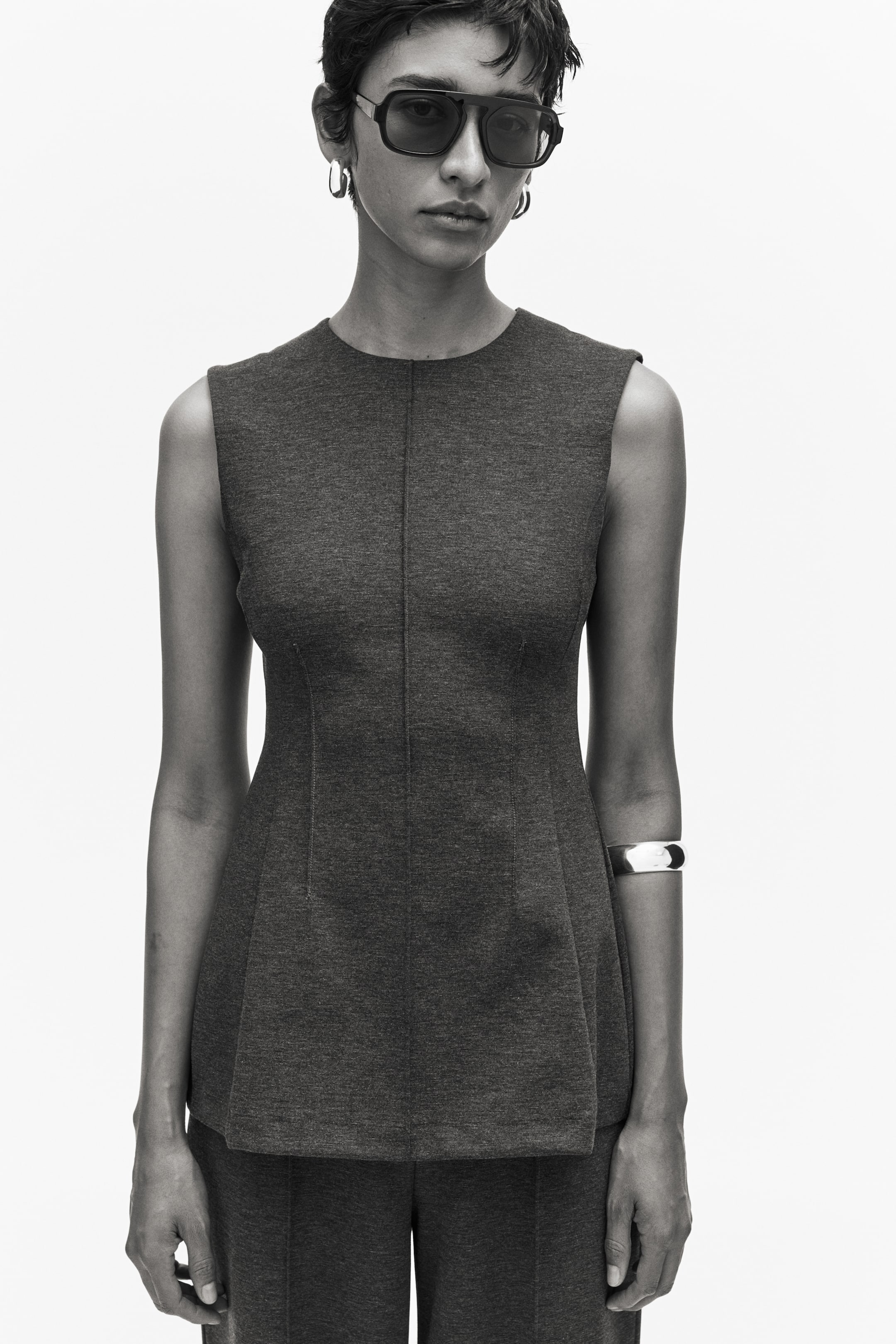 Tričko bez rukávov z džerseja ponte di Roma s okrúhlym výstrihom a zapínaním na skrytý zips na chrbte. Našité ozdobné zámiky a princesové švy v páse na vytvorenie zúženej siluety.