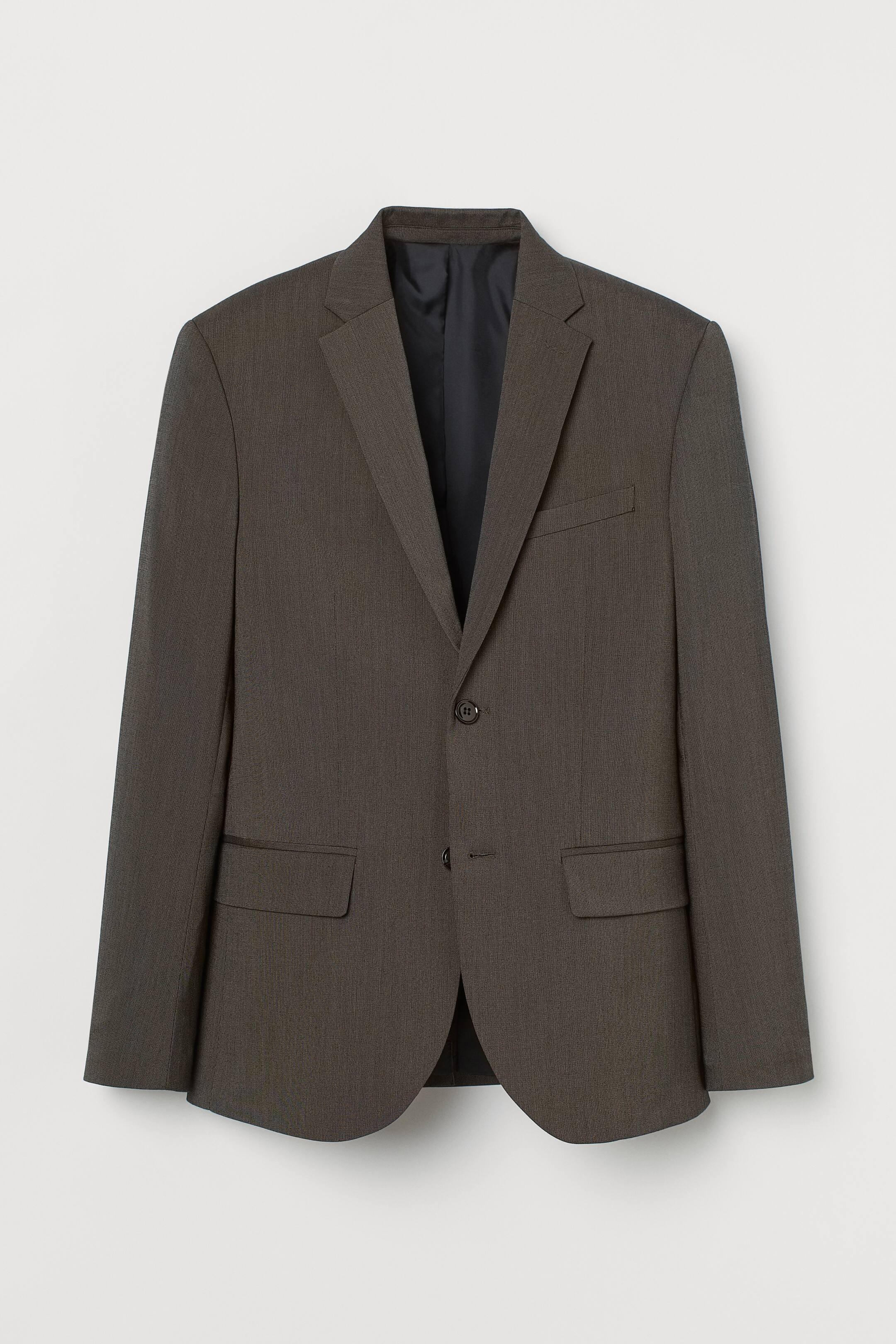 Sako sa jednorednim kopčanjem od rastegljive tkanine sa uskim reverima sa zarezima i ukrasnom rupom za dugme, džepom u nivou grudi, prednjim džepovima na preklop i jednim unutrašnjim džepom. Dva dugmeta napred, ukrasna dugmad na manžetnama i jedan šlic pozadi. Uski kroj koji se pripija uz obline tela i stvara svedenu siluetu. Sa postavom.