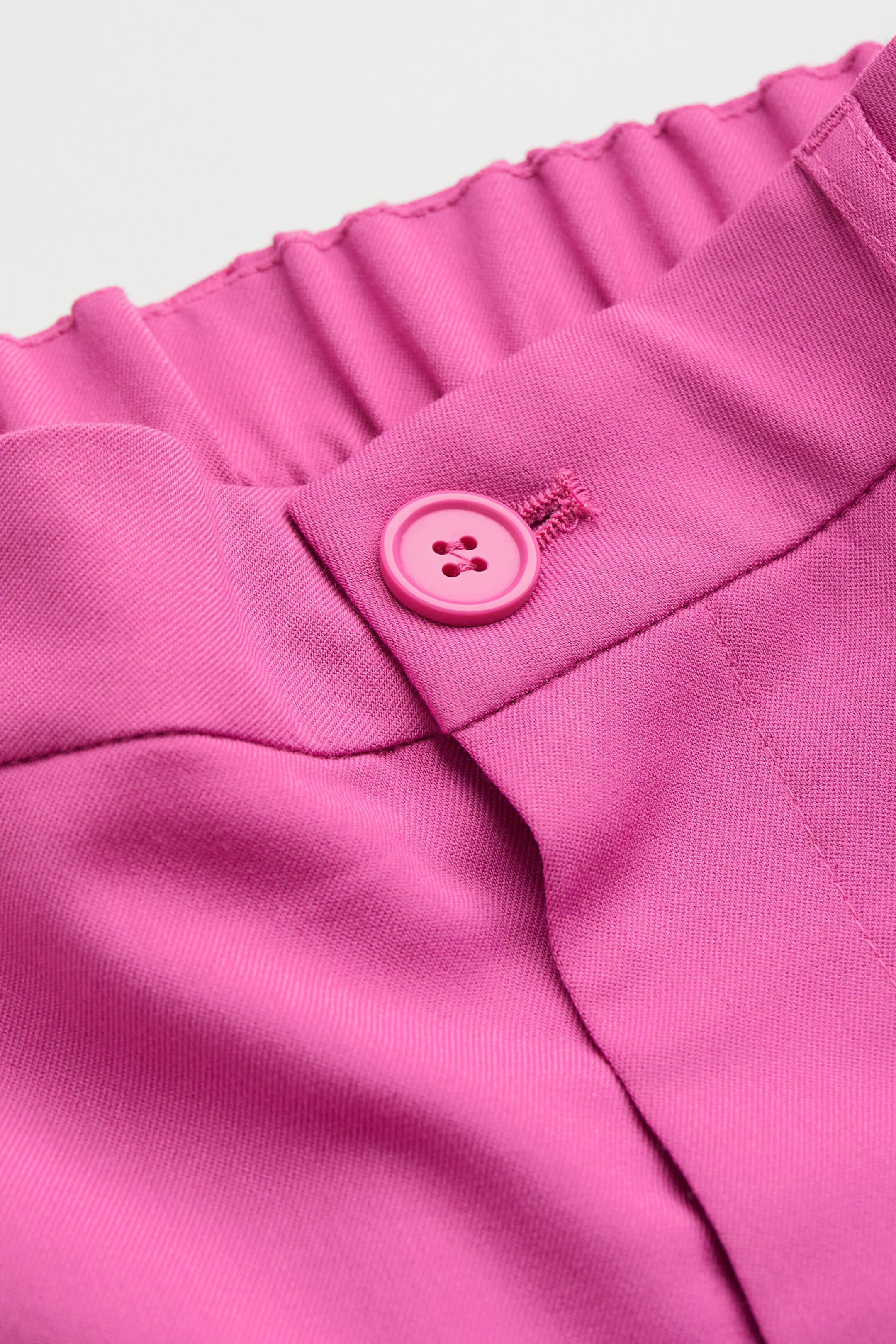 Široke pantalone visokog struka od blago rastegljive tkanine, sa ušivenim lastišem u zadnjem delu struka. Šlic s rajsferšlusom i dugmetom, bočni džepovi i ravne nogavice sa faltom napred.
