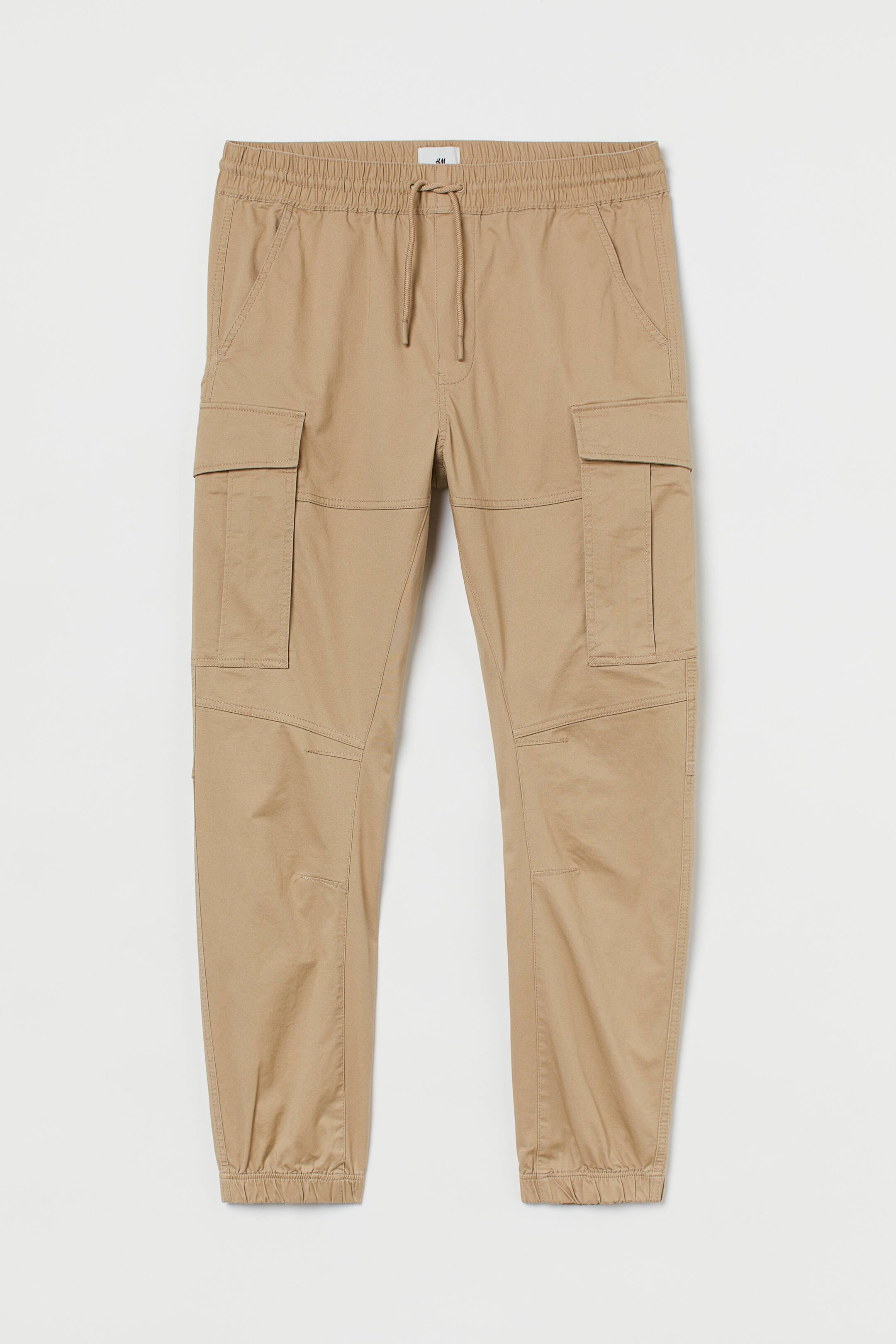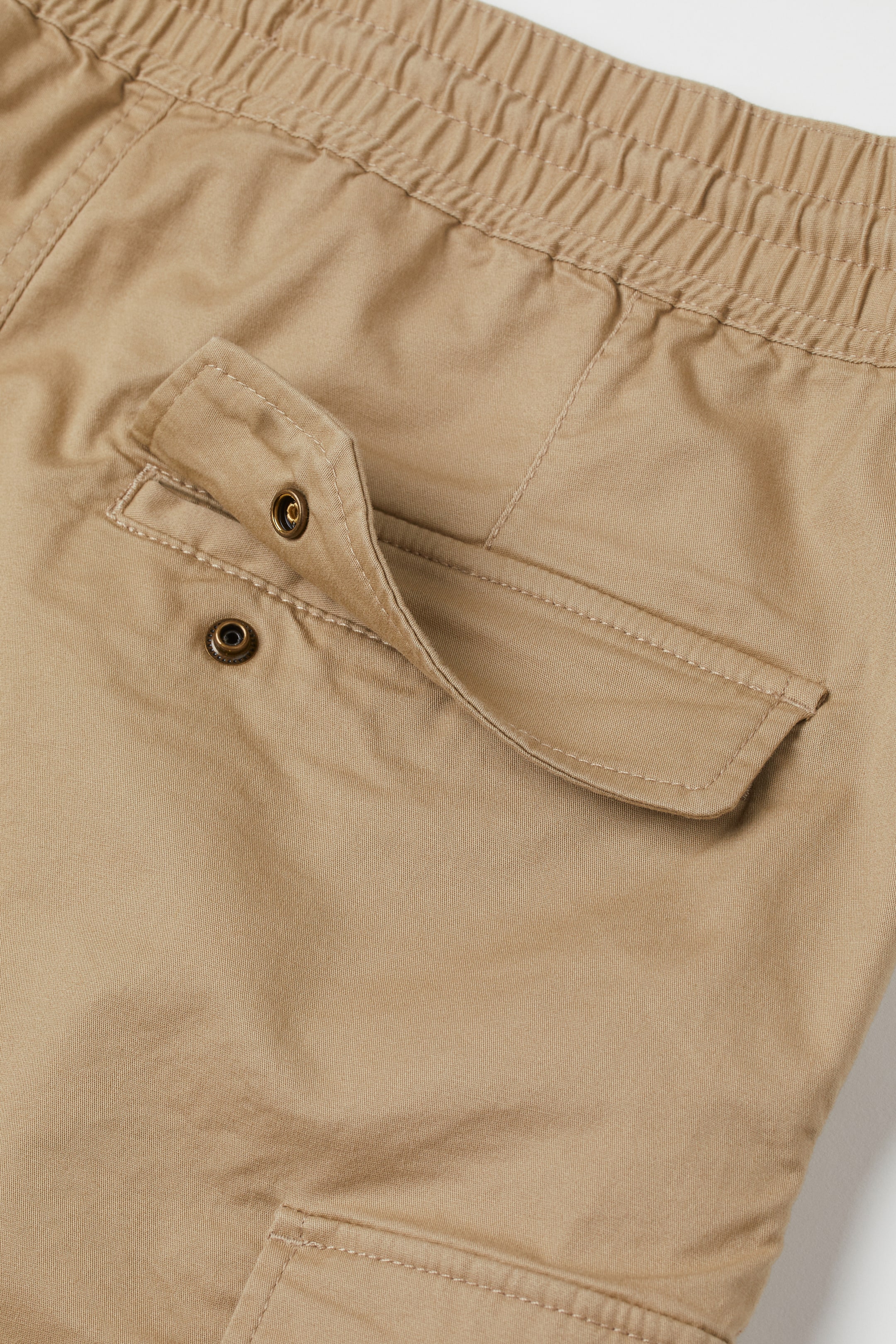 Pantalone od pamučne tkanine sa ušivenim lastišem i učkurom u struku, lažnim šlicem i kosim bočnim džepovima; zadnji džep i džepovi na nogavicama sa preklopom i skrivenim drikerima. Nogavice se sužavaju nadole, sa šavovima i ušicima u nivou kolena i ušivenim lastišem na krajevima.