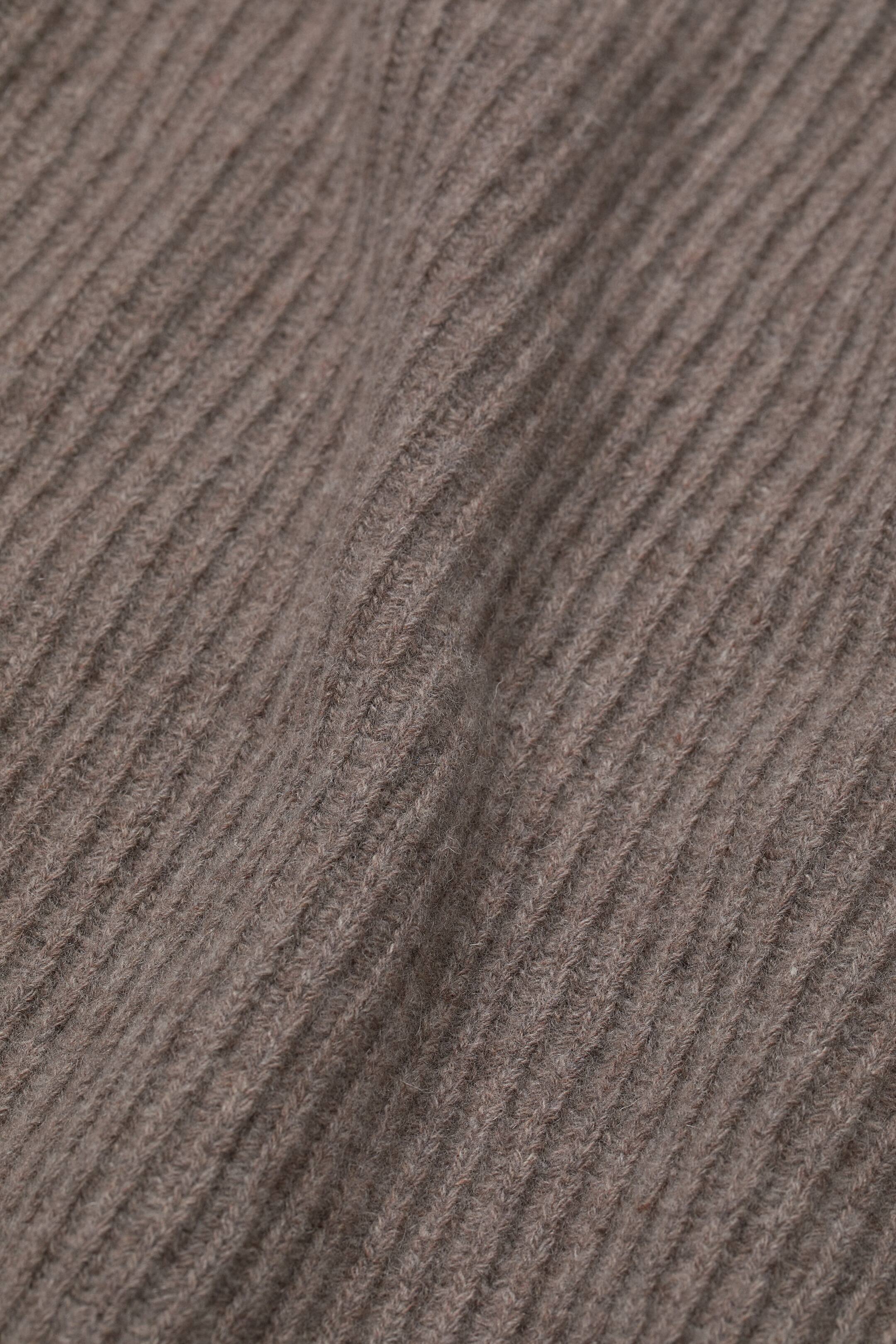 Kratki džemper od mekog, rebrastog vunenog pletiva delimično od kašmira sa visokom kragnom, spuštenim ramenima i izuzetno dugim rukavima.