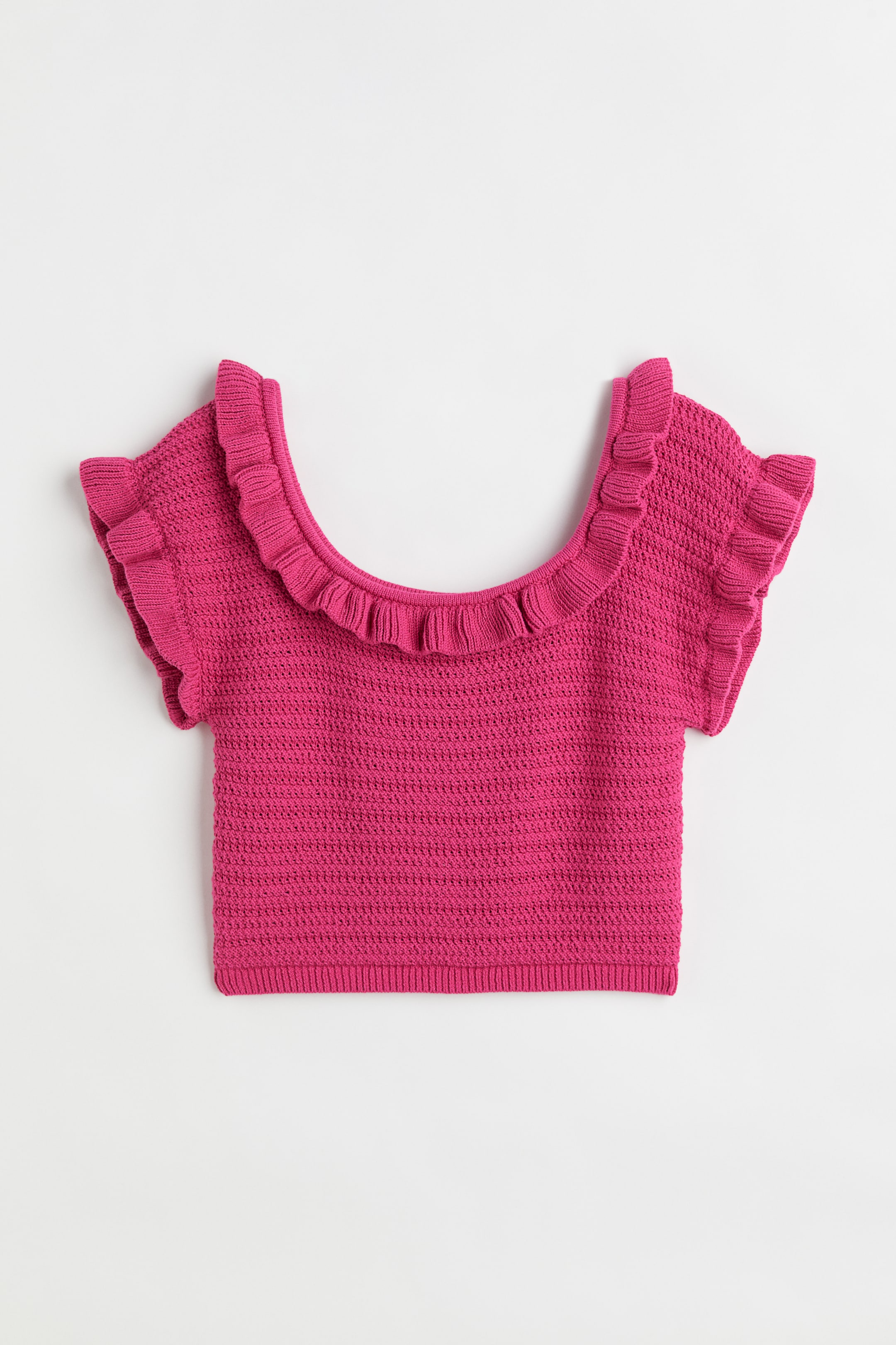 Uski, pleteni krop top heklanog efekta. Široki, četvrtasti izrez sa karner porubom oko celog ruba, kratki rukavi s karner porubom i rebrast donji rub.