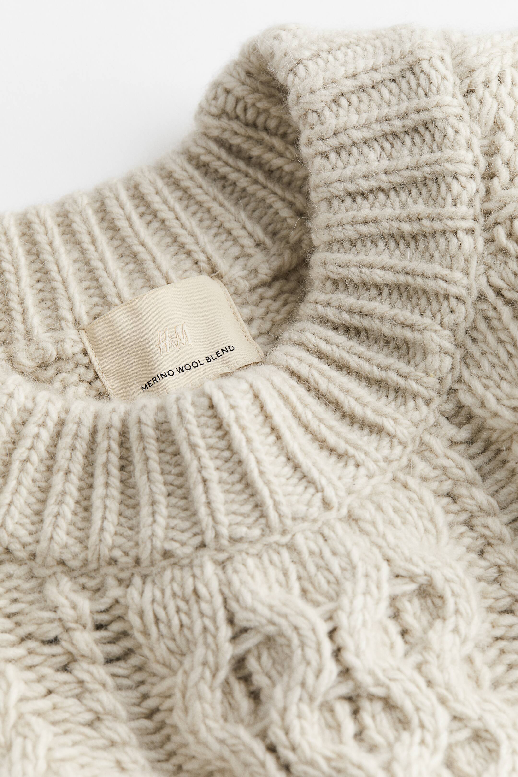 Džemper od mekog mešanog vunenog pletiva delimično od vune alpake u bodu pletenice. Širokog kroja, s okruglim izrezom i dugim rukavima sa šavom koji prati oblik ramena. Rebraste ranfle oko izreza, rukava i donjeg ruba.