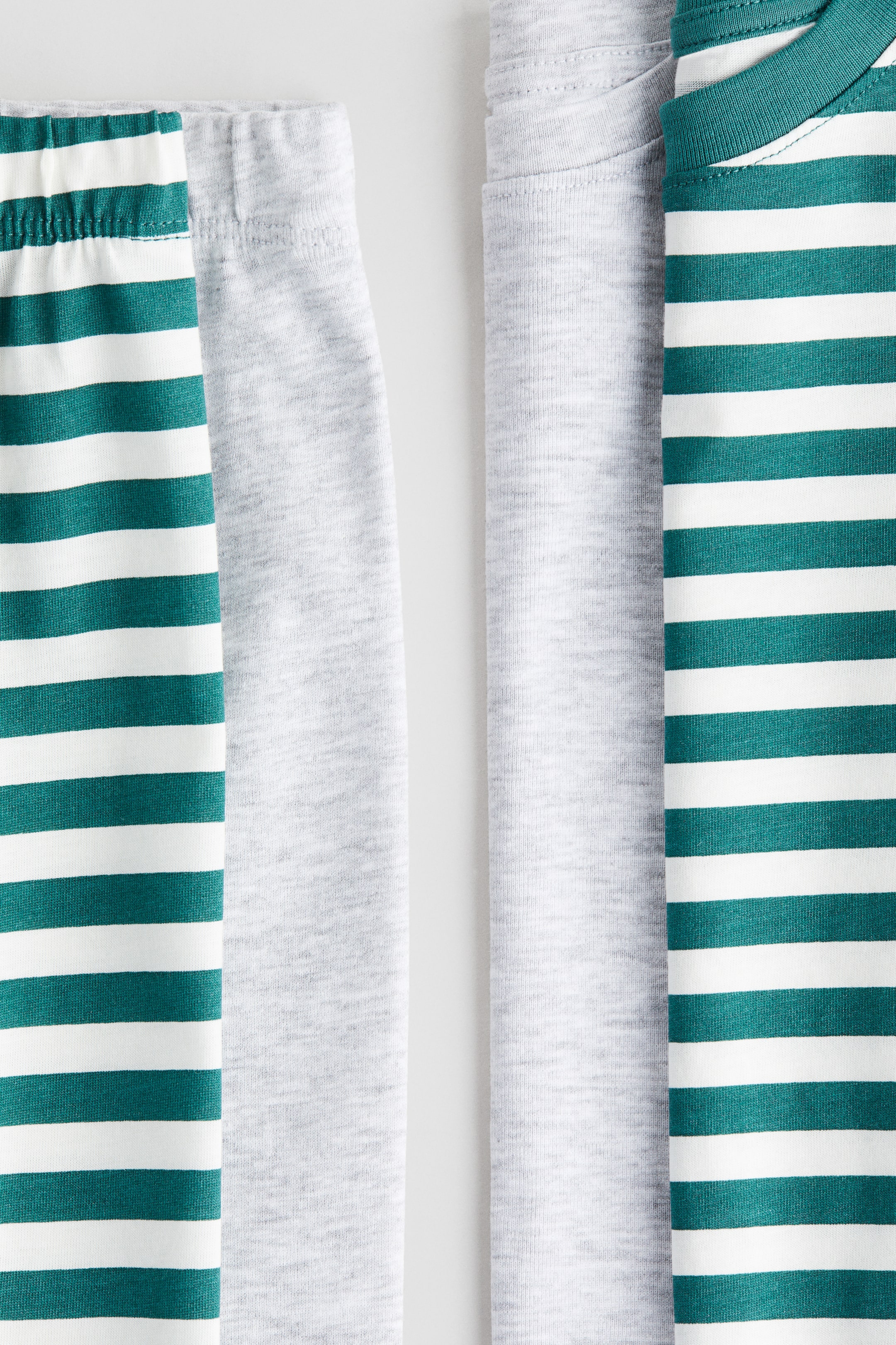 Pidžama od mekog pamučnog žerseja sa dezenom. Gornji delovi dugih rukava sa okruglim, rebrastim izrezom i rebrastim ranflama na rukavima. Donji delovi s rastegljivim strukom i rebrastim ranflama na krajevima nogavica.