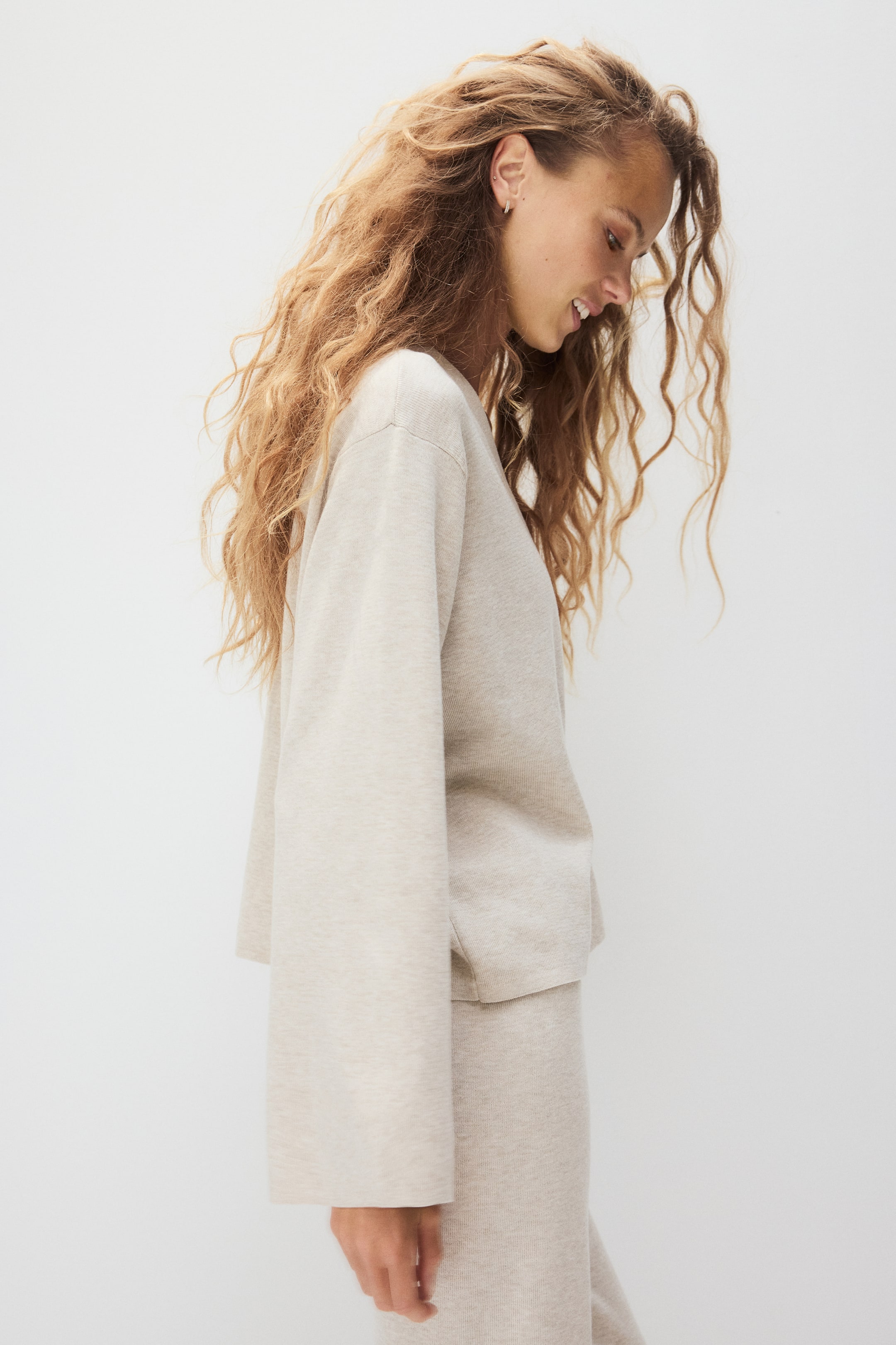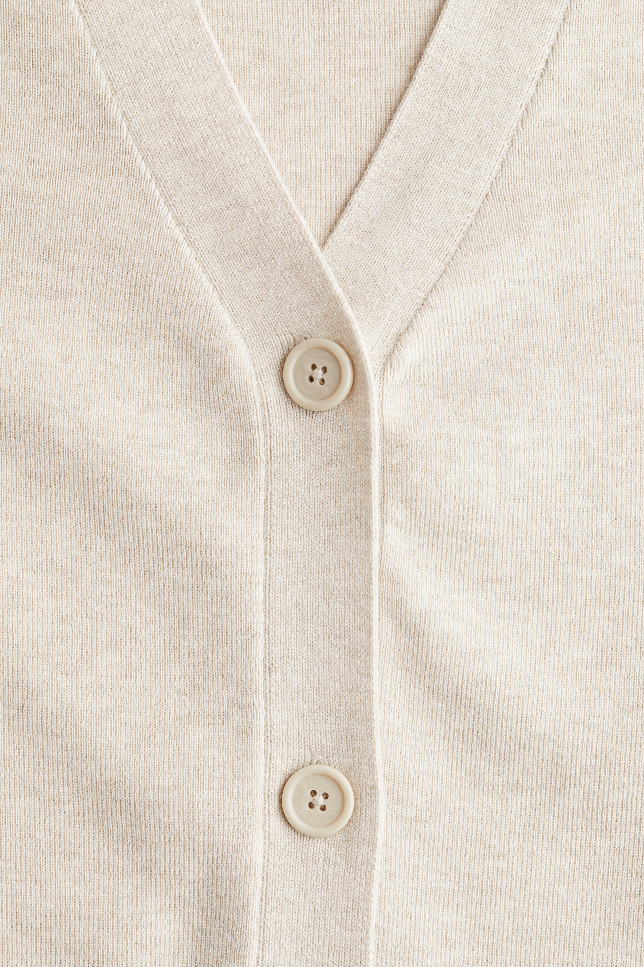 Džemper na kopčanje od mekog, finog pletiva s dubokim V-izrezom i dugmićima duž prednje strane. Spuštena ramena, dugi rukavi i rebraste ranfle na rukavima i donjem rubu.