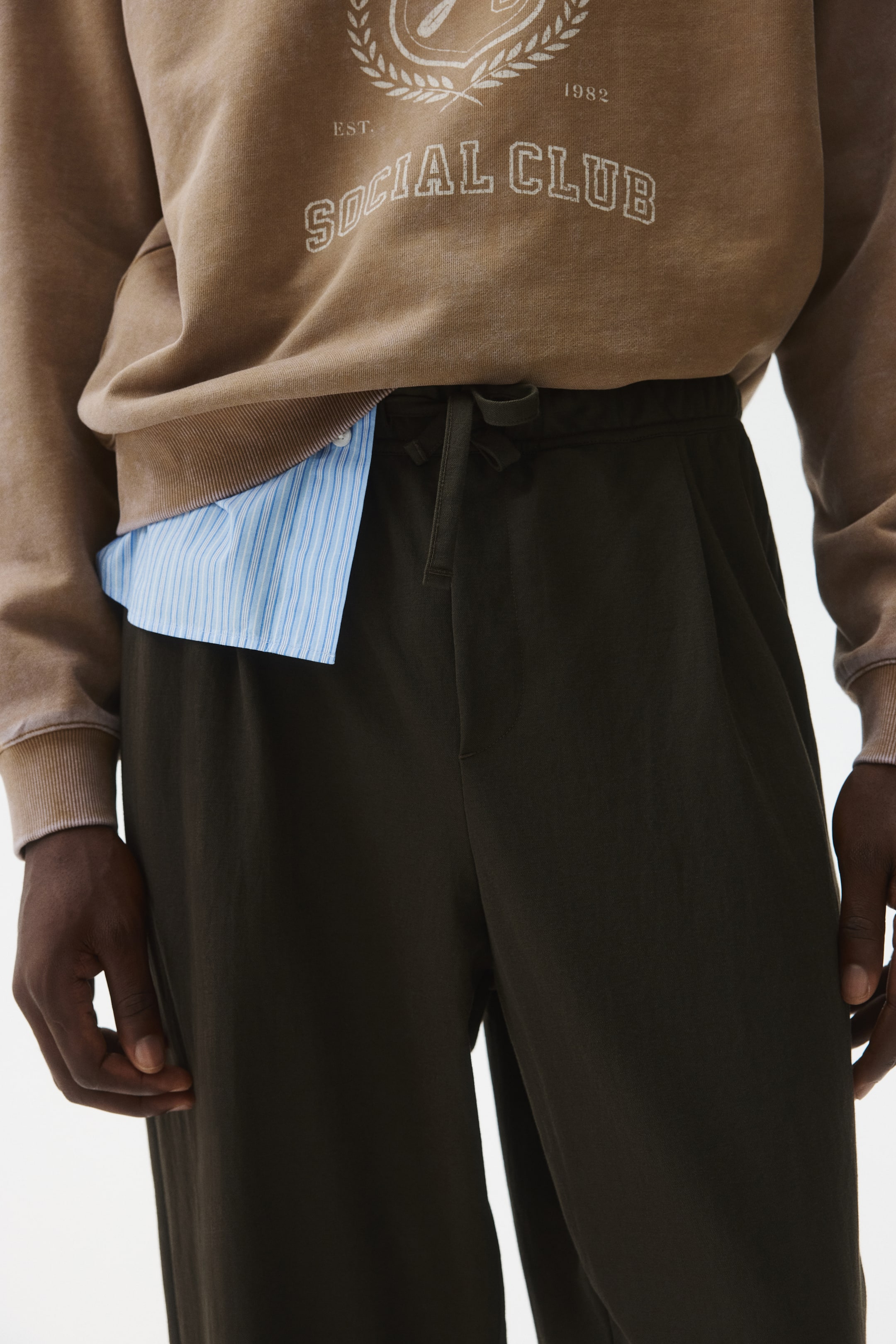 Pantalone od meke mešane pamučne tkanine s ušivenim lastišem i učkurom u struku, kosim bočnim džepovima i našivenim zadnjim džepovima s dugmetom. Opuštenog, ležernog kroja koji istovremeno ne prenaglašava siluetu.