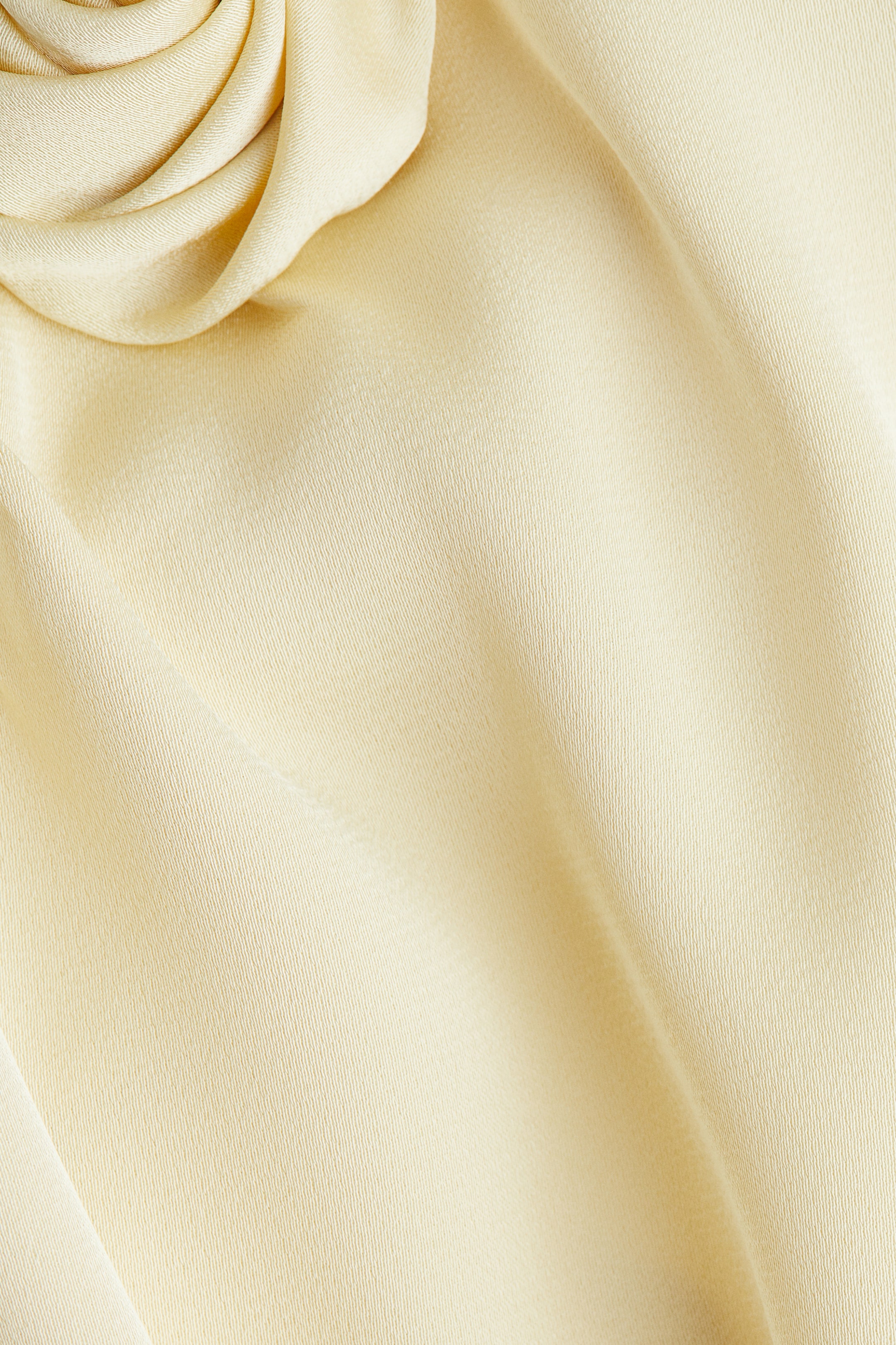 Kratka, uska haljina od blago drapiranog satena. S drapiranim izrezom sa ukrasnom ružom s jedne strane, tankim bretelama koje se provlače kroz male omče i vezuju pozadi i nisko sečenim leđima. Bez postave.