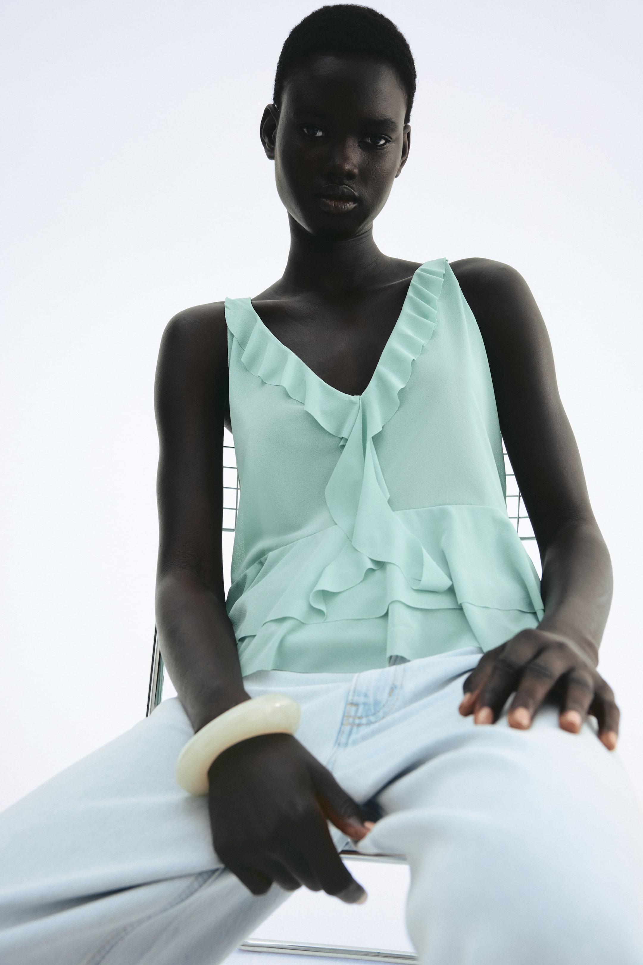 Bluza bez rukava od prozirnog žerseja sa širokim bretelama i dubokim V-izrezom s lepršavim karnerom koji se nastavlja duž prednje strane. Dvoslojni karner pri dnu.