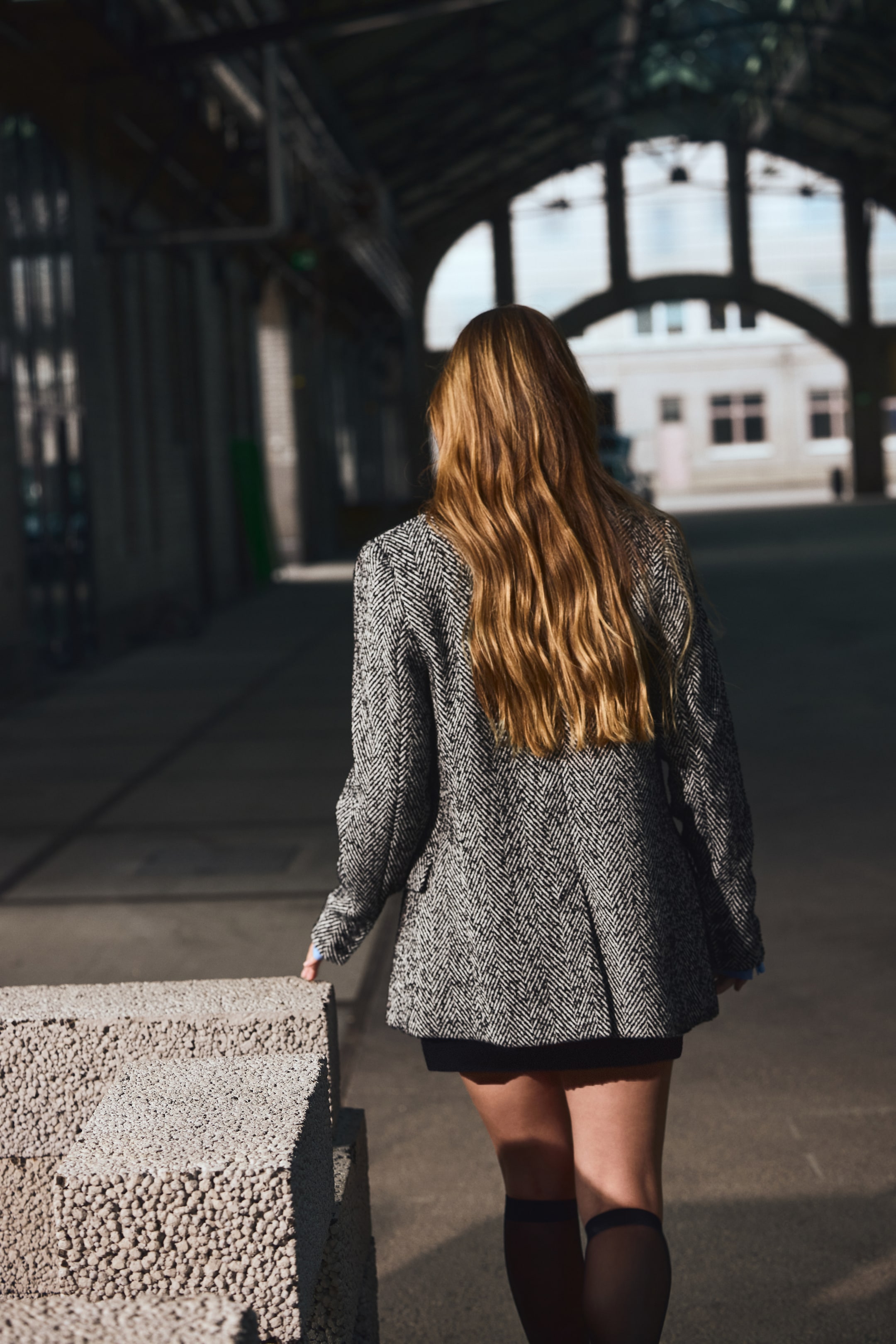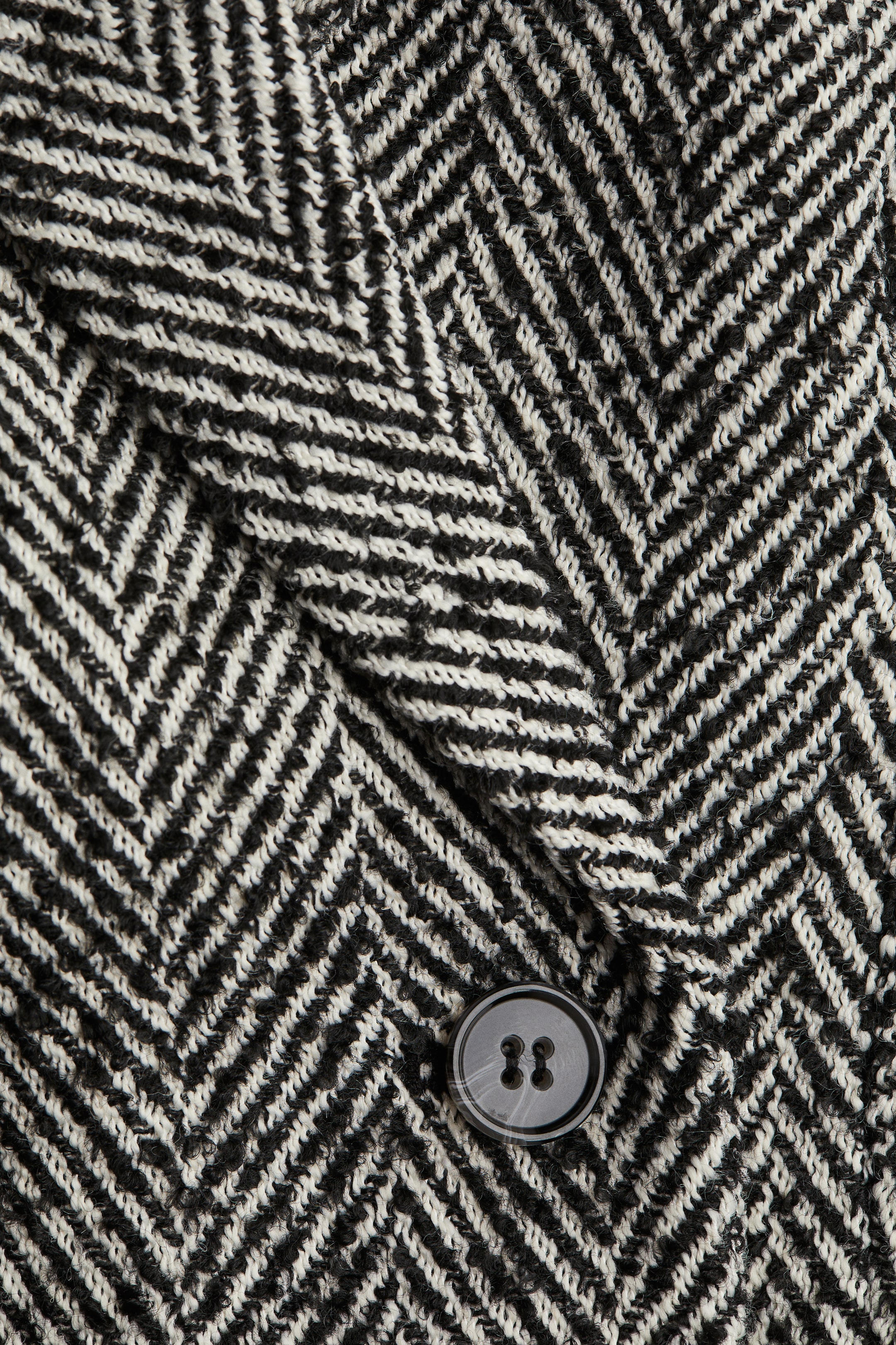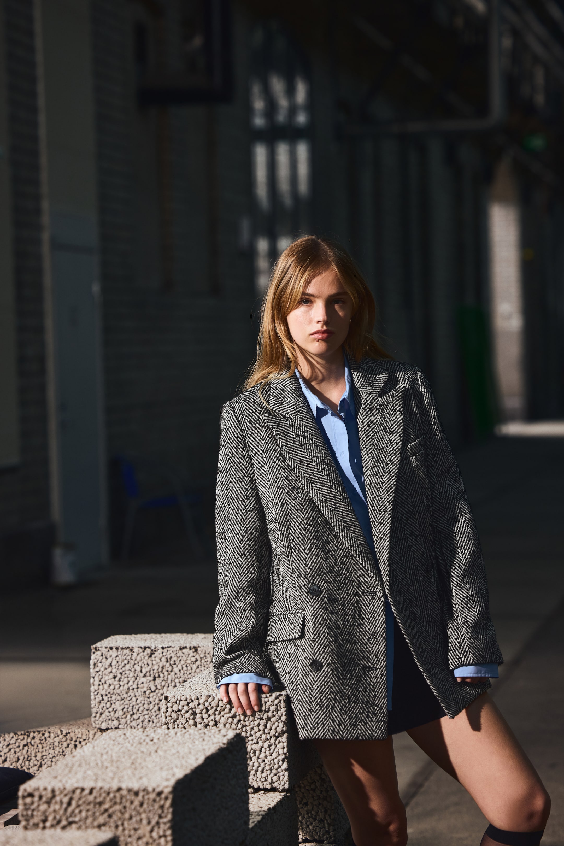 Blejzer sa dvorednim kopčanjem od izdržljive reljefne tkanine sa reverima sa zarezima i dugmićima napred. Naramenice, dugi rukavi sa dugmićima na manžetnama i prednji džepovi sa preklopom. Jedan šlic pozadi. Sa postavom.