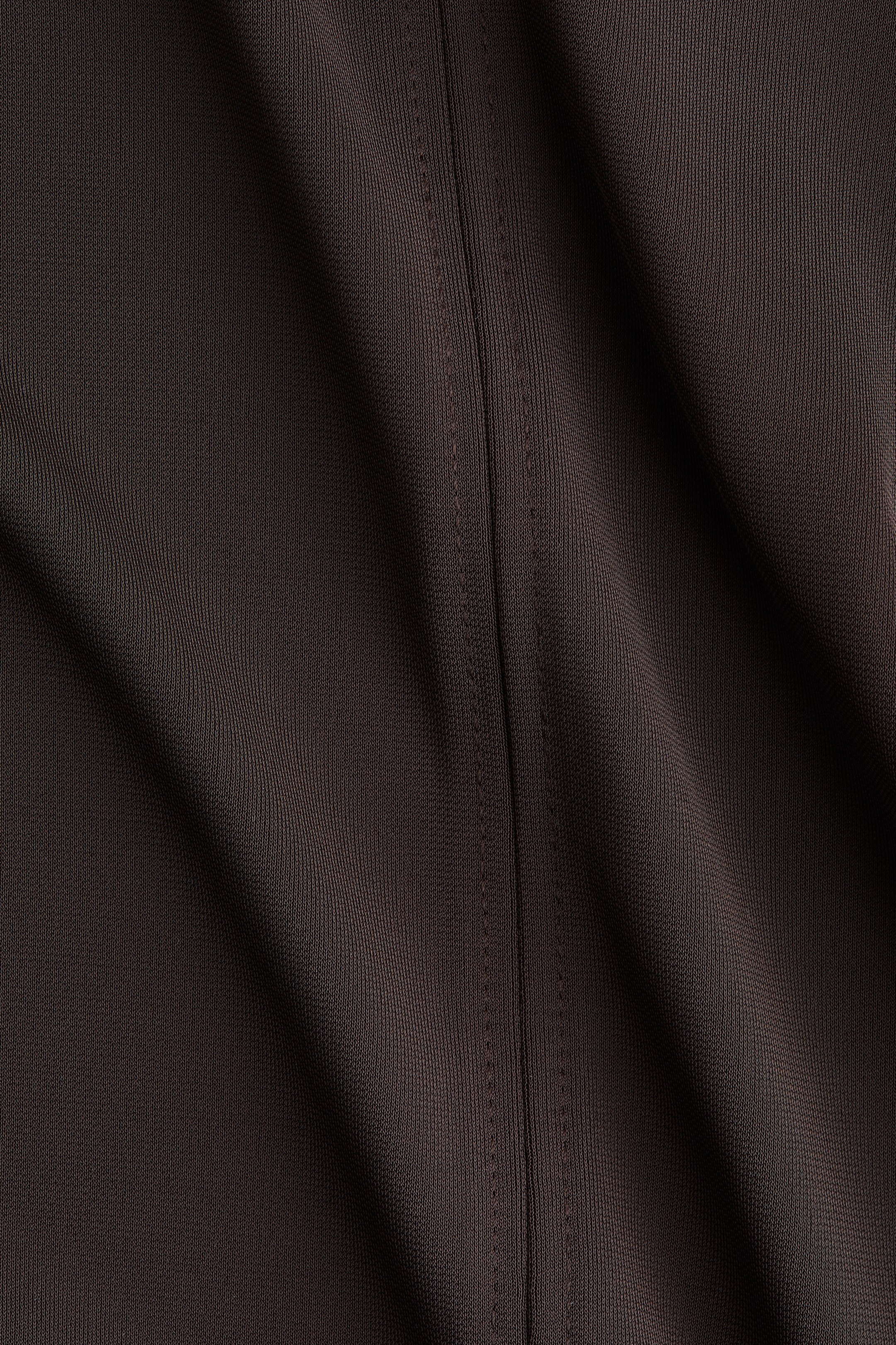 Pantalone od blago drapiranog, rastegljivog žerseja. Visok struk sa skrivenim lastišem i širokim nogavicama s dvostrukim površinskim šavovima duž prednje strane.