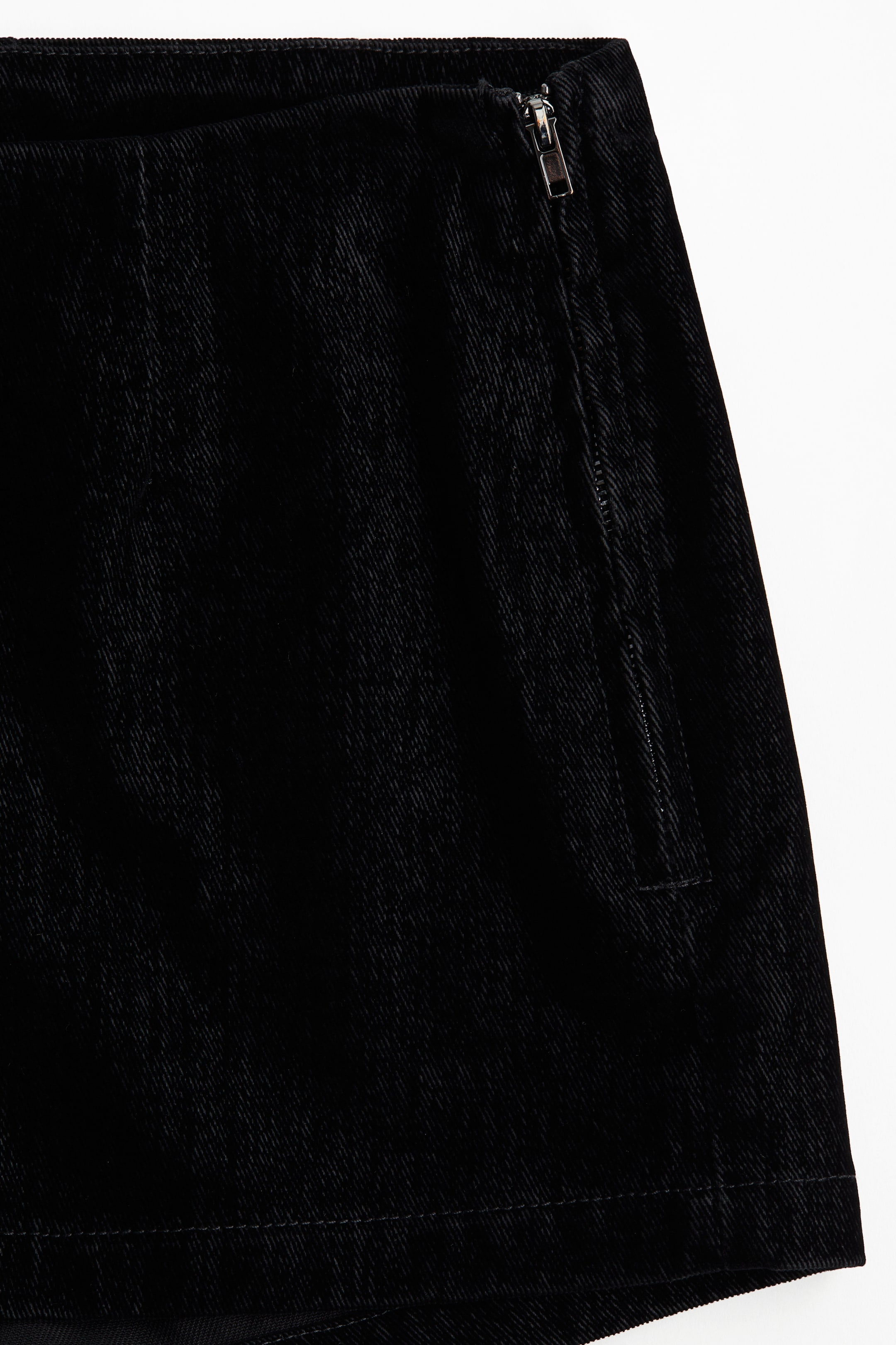 Uski mini šorts od teksasa s visokim strukom sa skrivenim rajsferšlusom i dugmetom na jednom boku.