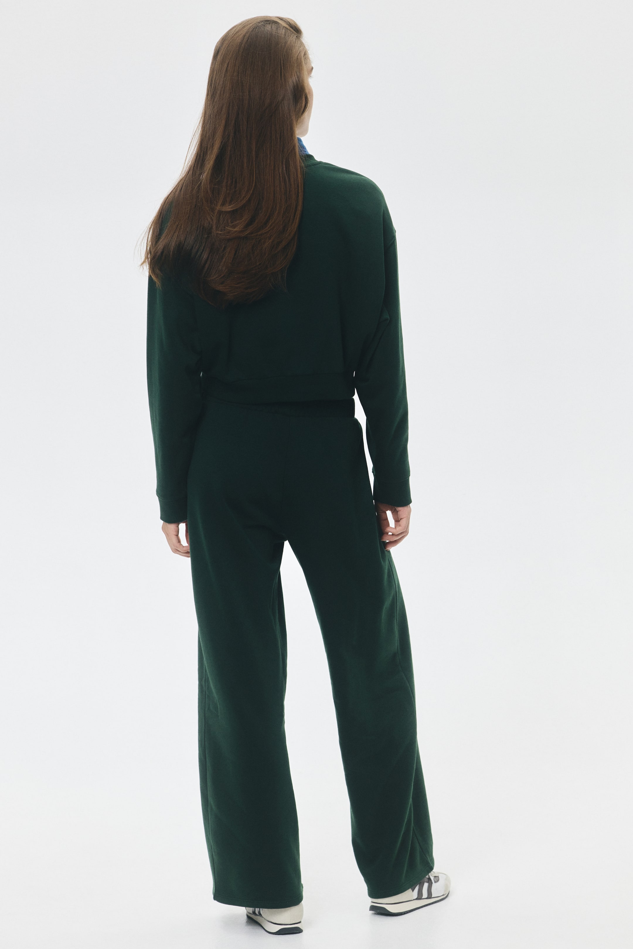 Dvodelna trenerka od duks materijala sa mekom, četkanom unutrašnjom stranom. Dukserica sa okruglim rebrastim izrezom, spuštenim ramenima i ranflama na rukavima i donjem rubu. Pantalone s ušivenim lastišem u struku i širokim nogavicama s ušivenim ivicama duž prednje strane.