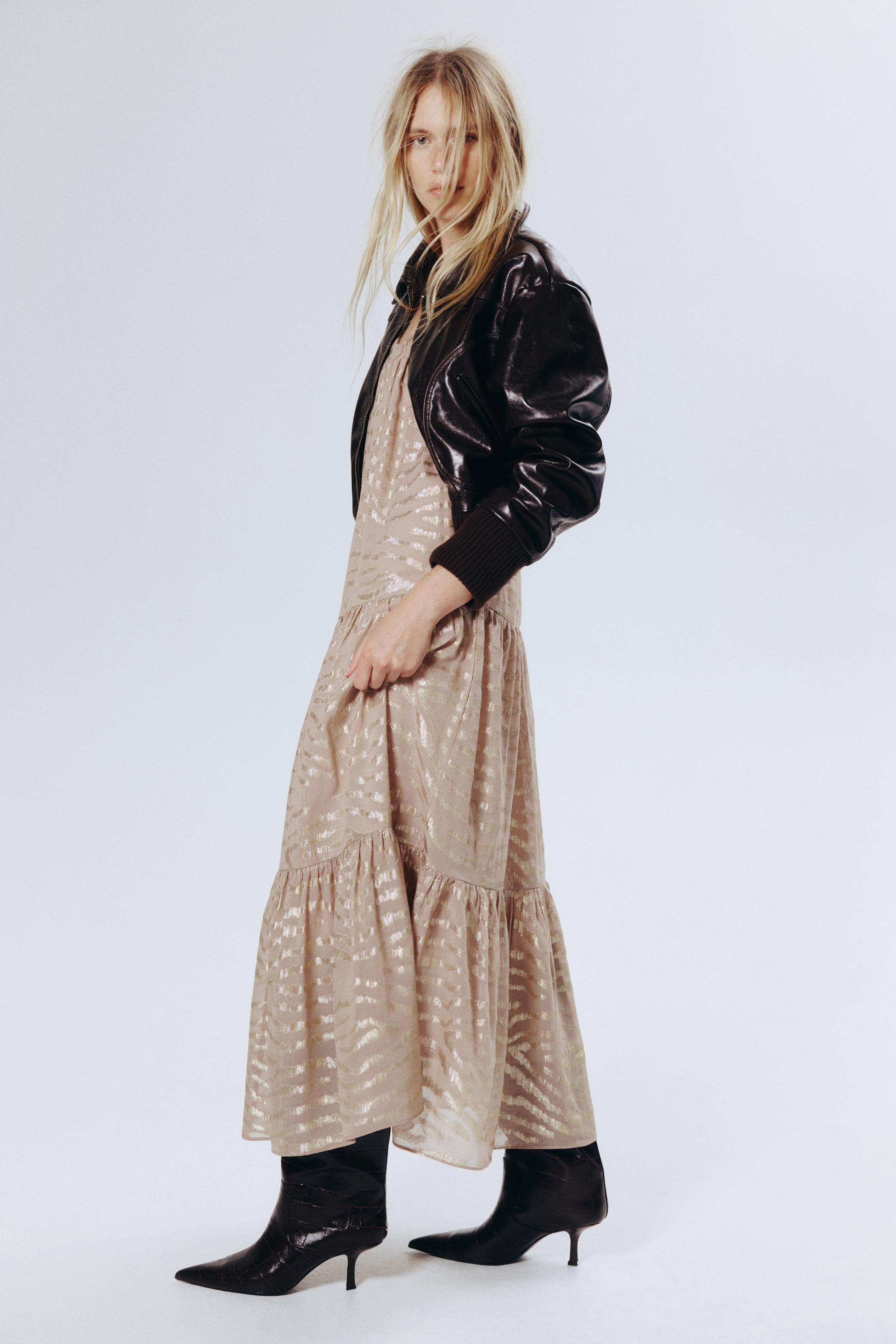 Duga, predimenzionisana haljina od sjajne žakarne tkanine sa svetlucavim nitima. Sa dubokim, okruglim izrezom s naborima napred i pozadi i dugim balon rukavima raglan kroja s rastegljivim krajevima. Zvonastog kroja, stepenasta i sa naborima za dodatnu punoću. Sa postavom.