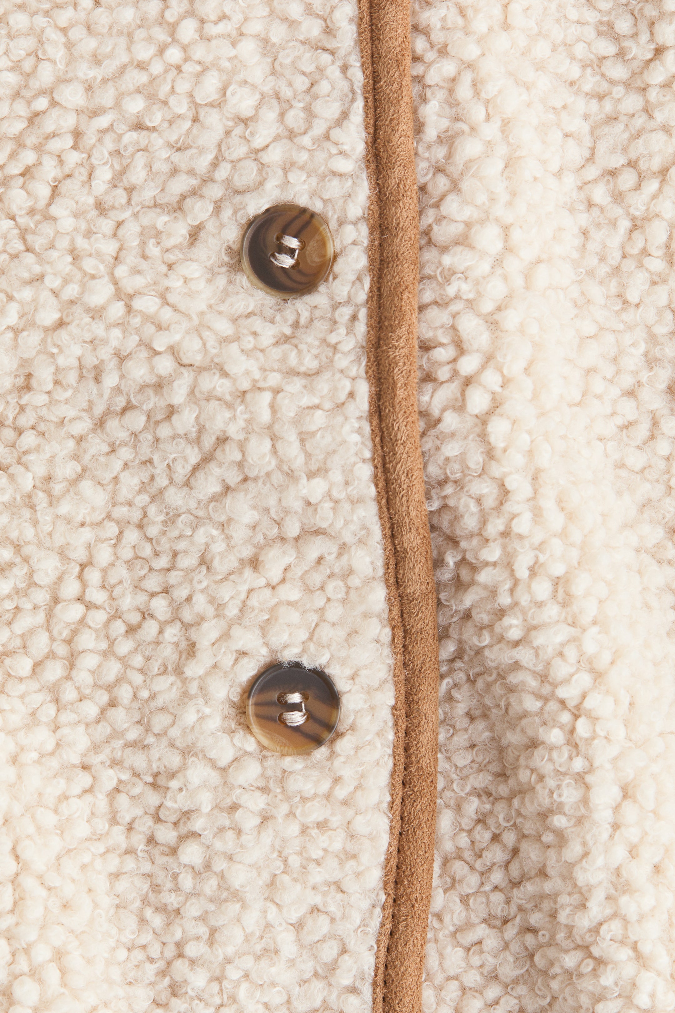 Džemper na kopčanje od mekog tedi materijala sa obrubom u kontrastnoj boji. Okrugli izrez i dugmići duž prednje strane.