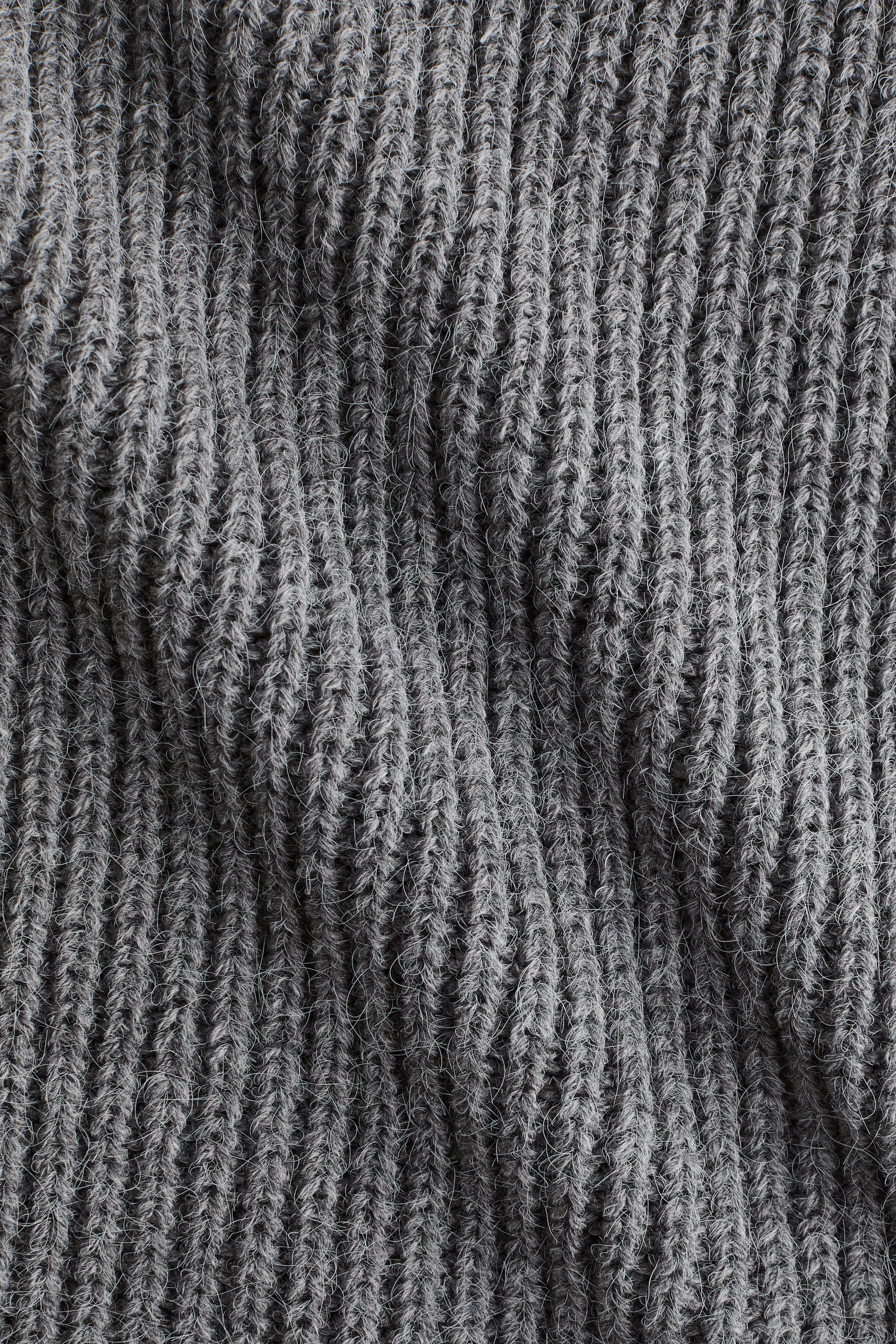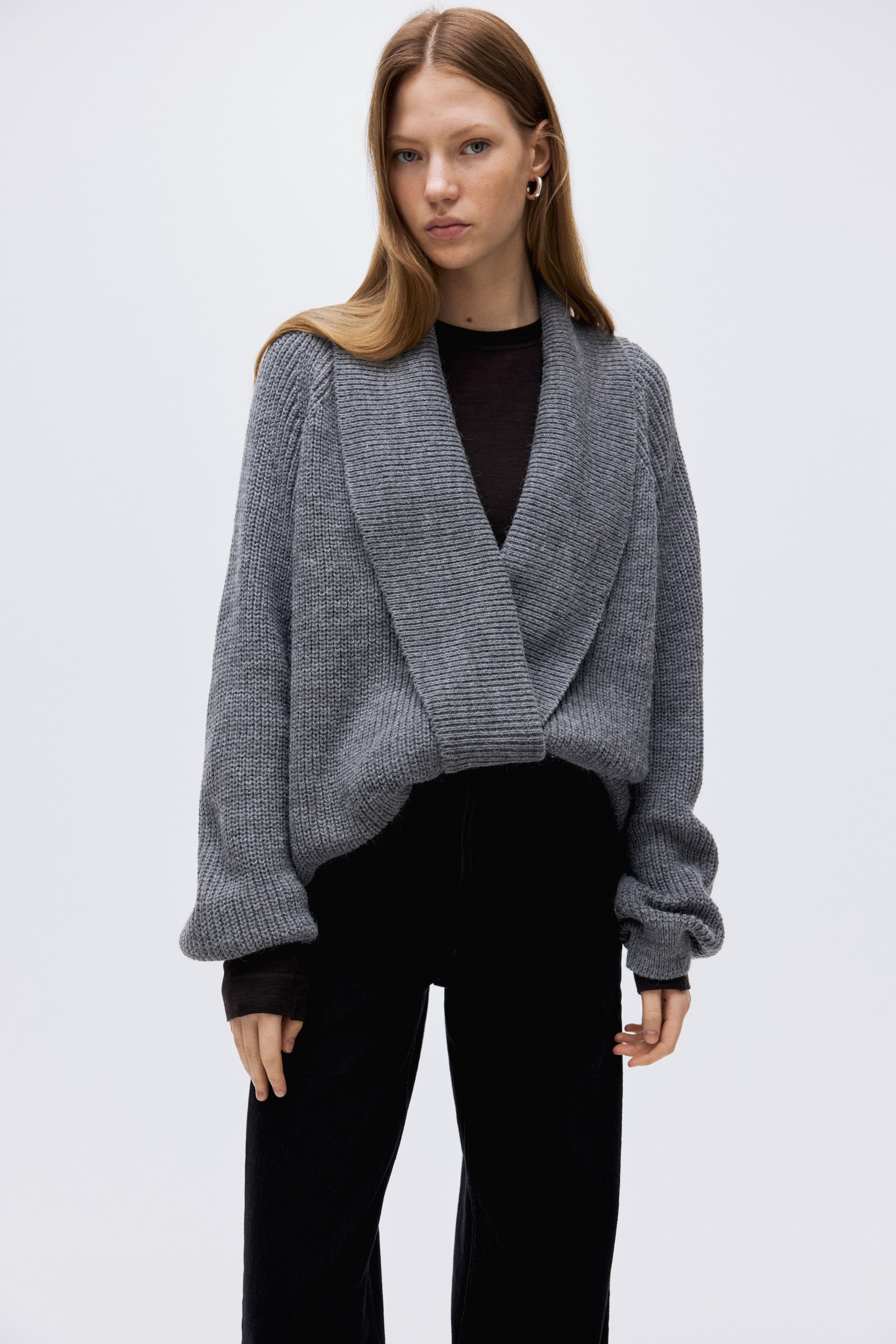 Predimenzionisani džemper od mekog rebrastog pletiva s prednjom stranom na preklop i dubokim V-izrezom. Dugi raglan rukavi koji se sužavaju prema kraju.