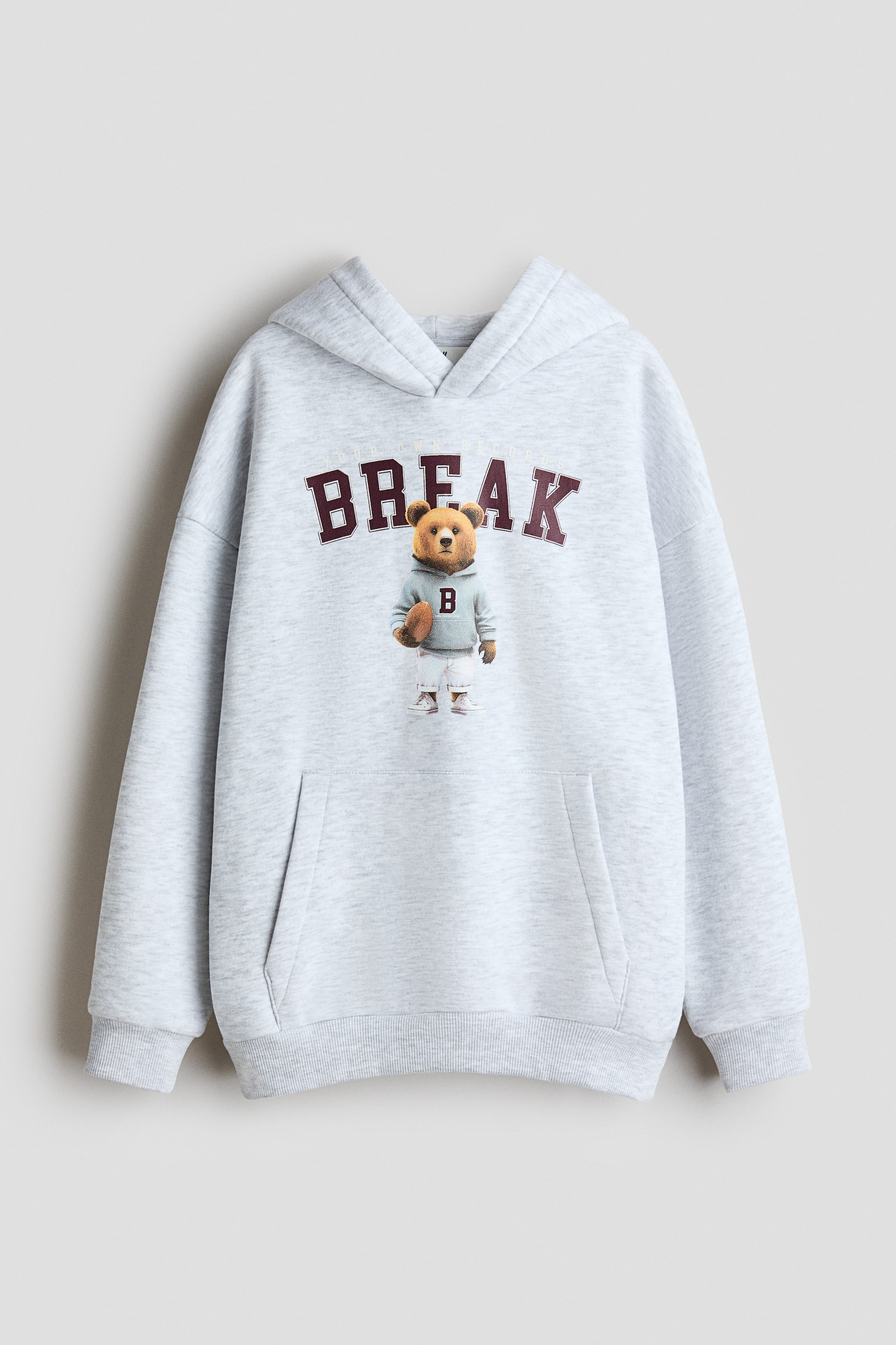 En huvtröja i sweatshirtkvalitet med lös passform och mjuk, borstad insida. Den har omlottlagd huva i dubbla lager, nedhasad axel, lång ärm och känguruficka. Ribbad mudd vid ärmslut och i nederkant.