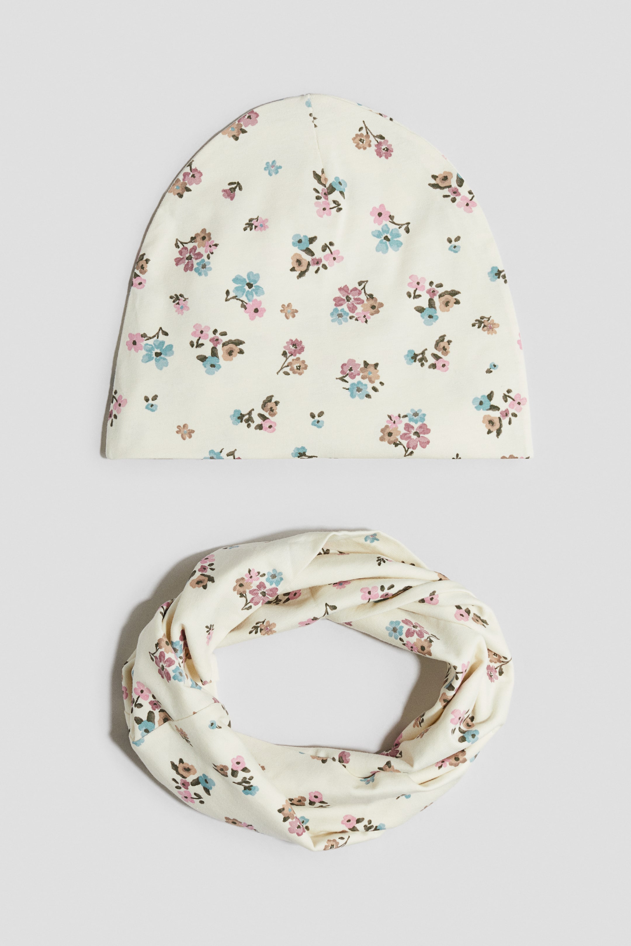 En mössa och en tubhalsduk i dubbla lager mjuk trikå med tryckt mönster.