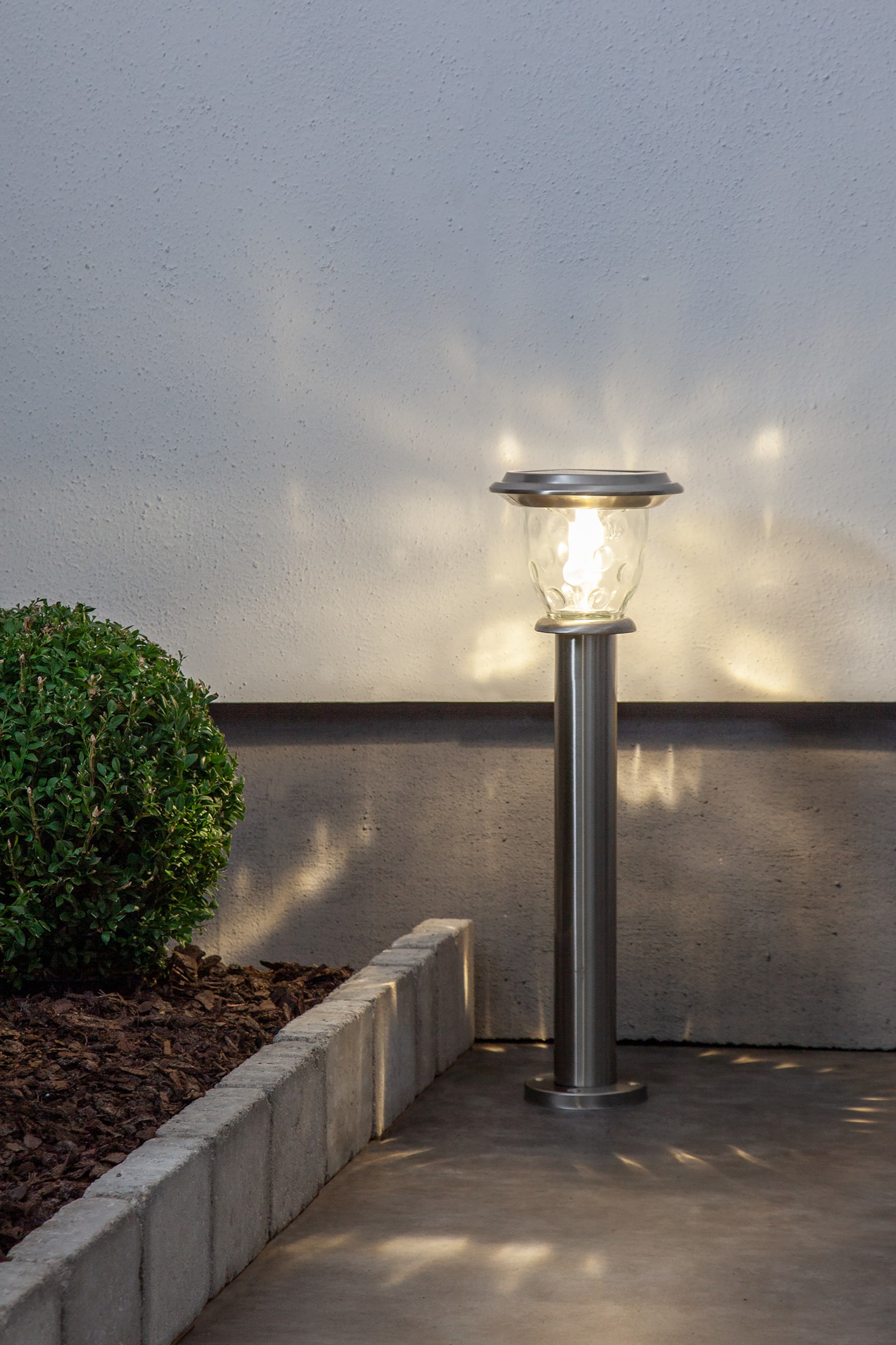 Solcellsdrivet gångljus som lyser med 20 Lumen i mörkret. Solcellspollarens bubbliga glas gör att det bildas ett vackert mönster på omgivningen. Höjd: 61cm. Som bredast är den 19cm.