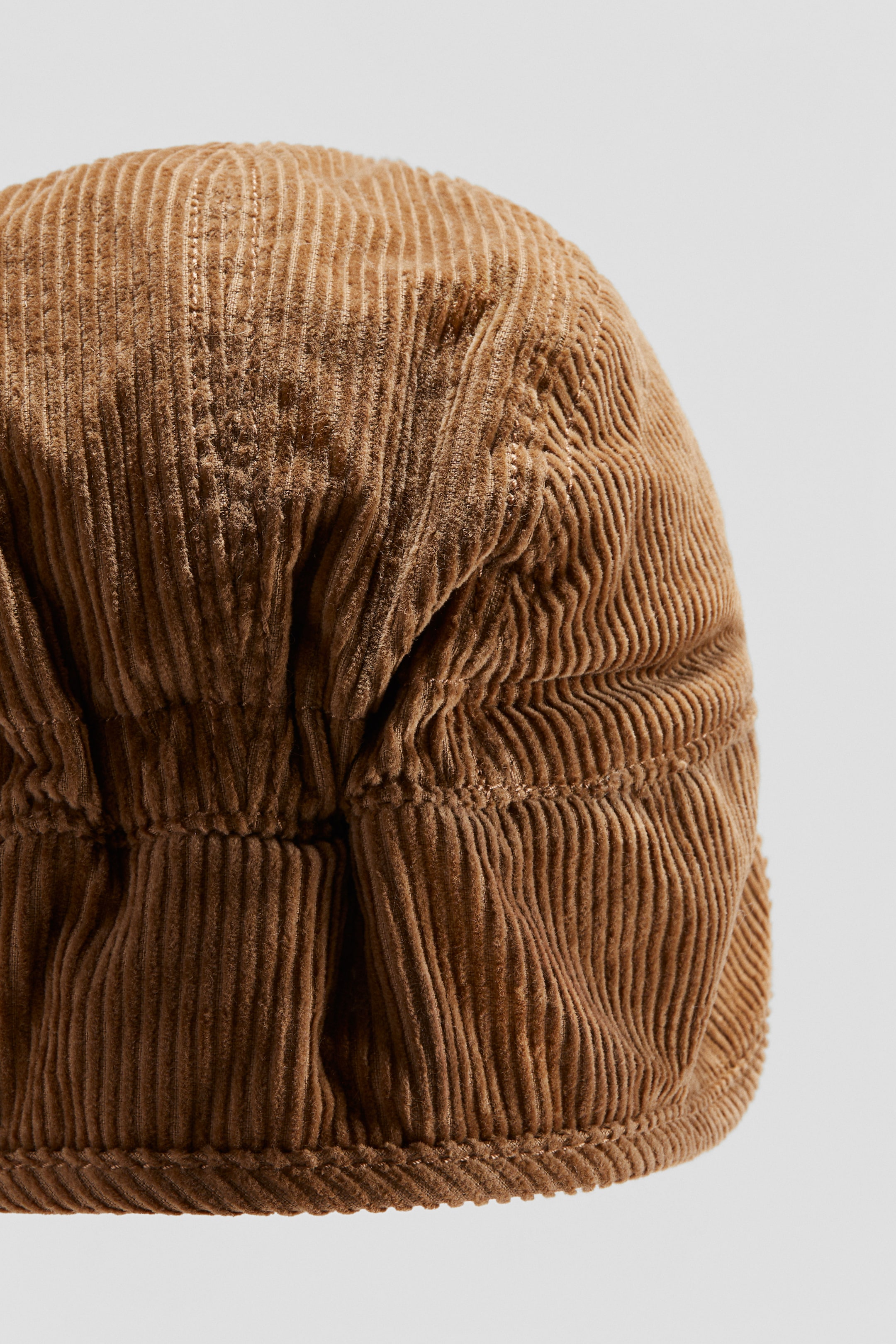 En keps i mjuk bomullsmanchester med foder i pile. Kepsen har klädd resår bak och nackskydd som fortsätter fram över öronen.