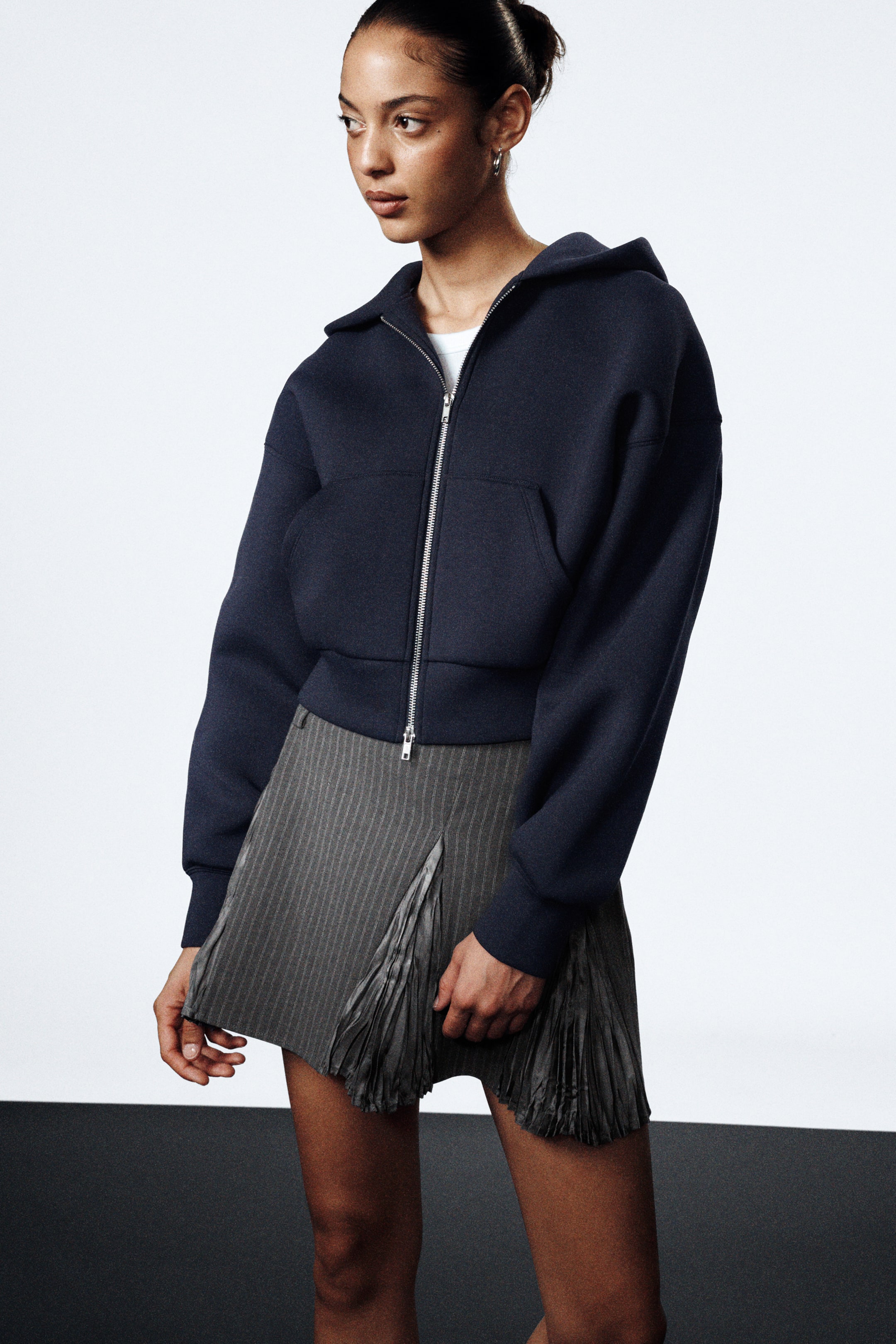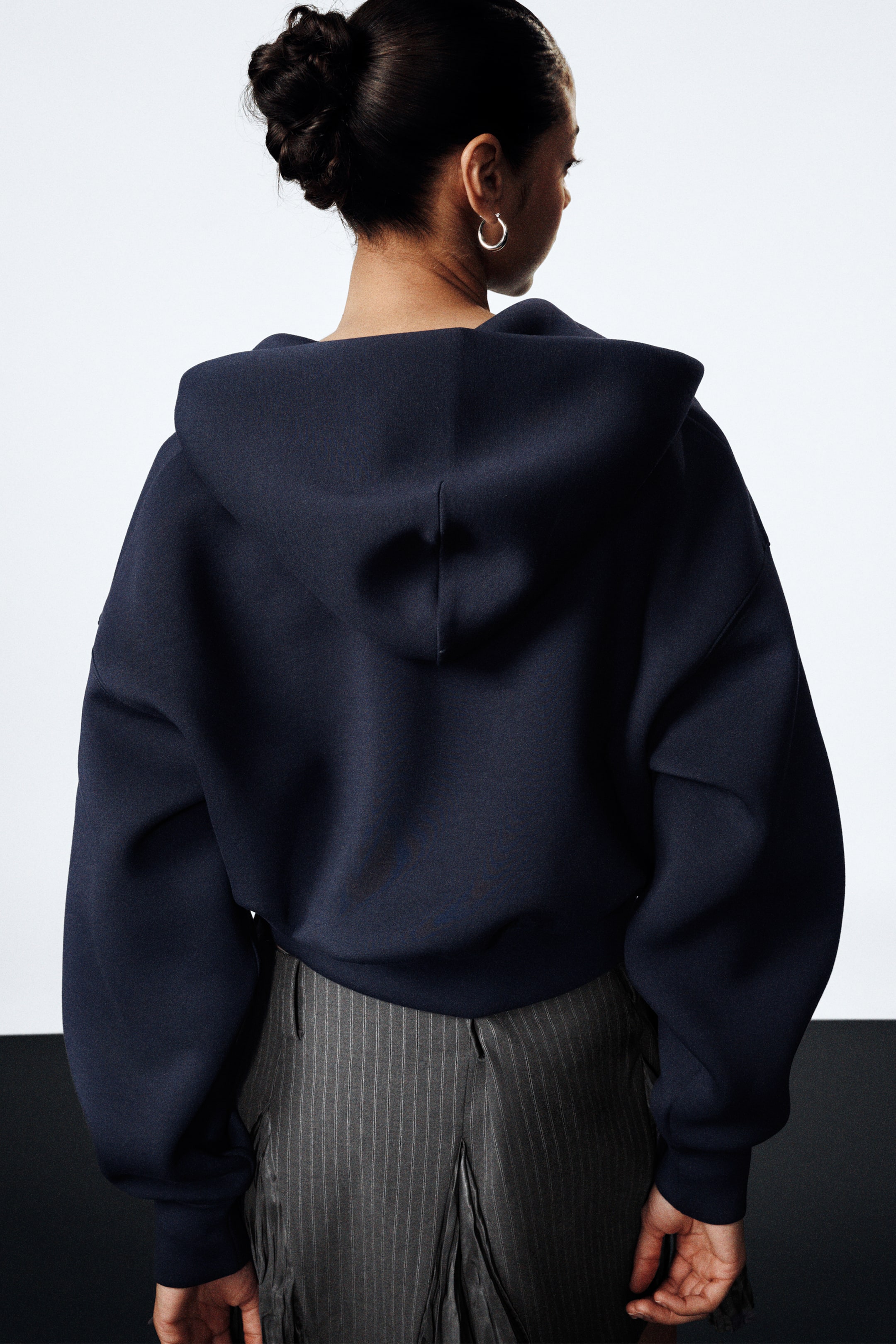 A scuba hoodie cut to a relaxed fit with a fitted waist, featuring an elasticated waistband. It has a front kangaroo pocket, a 2-way zipper and topstitch details.
