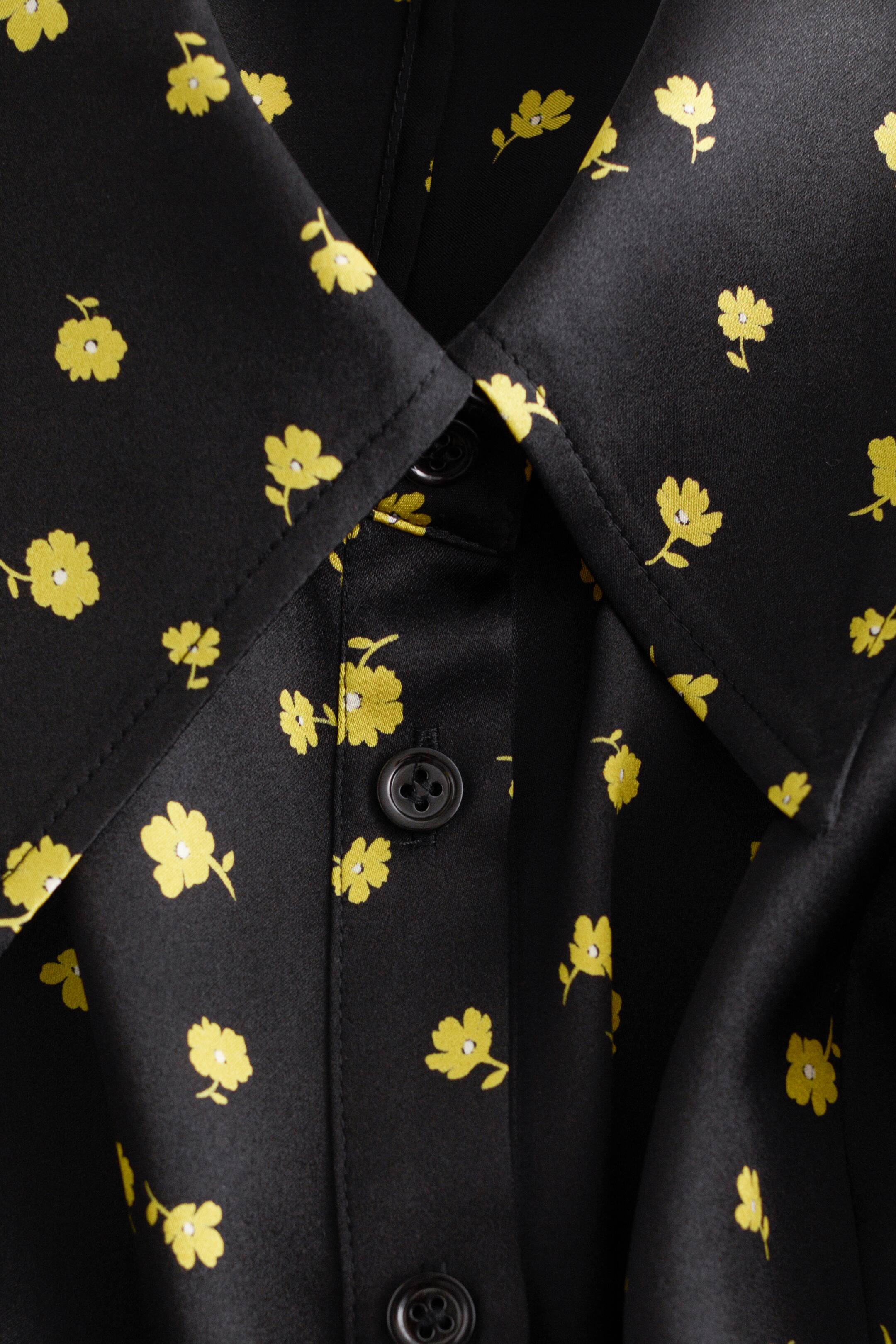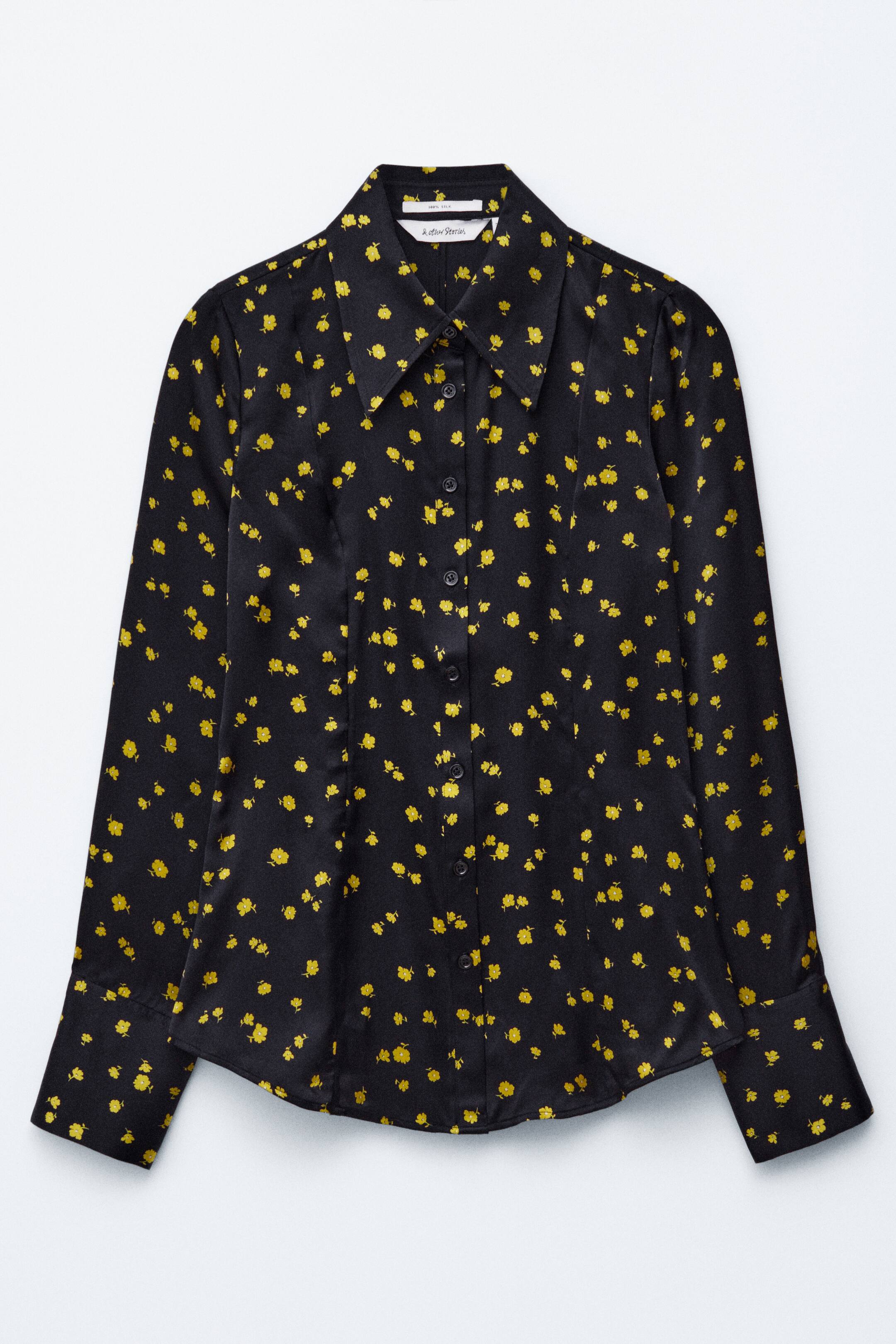 Långärmad sidenskjorta med spetsig krage och ärmslut med knappar. Skjortan har intagen midja med insnitt och knappslå fram. Figurnära passform Skjortans längd: 64 cm (storlek 38)