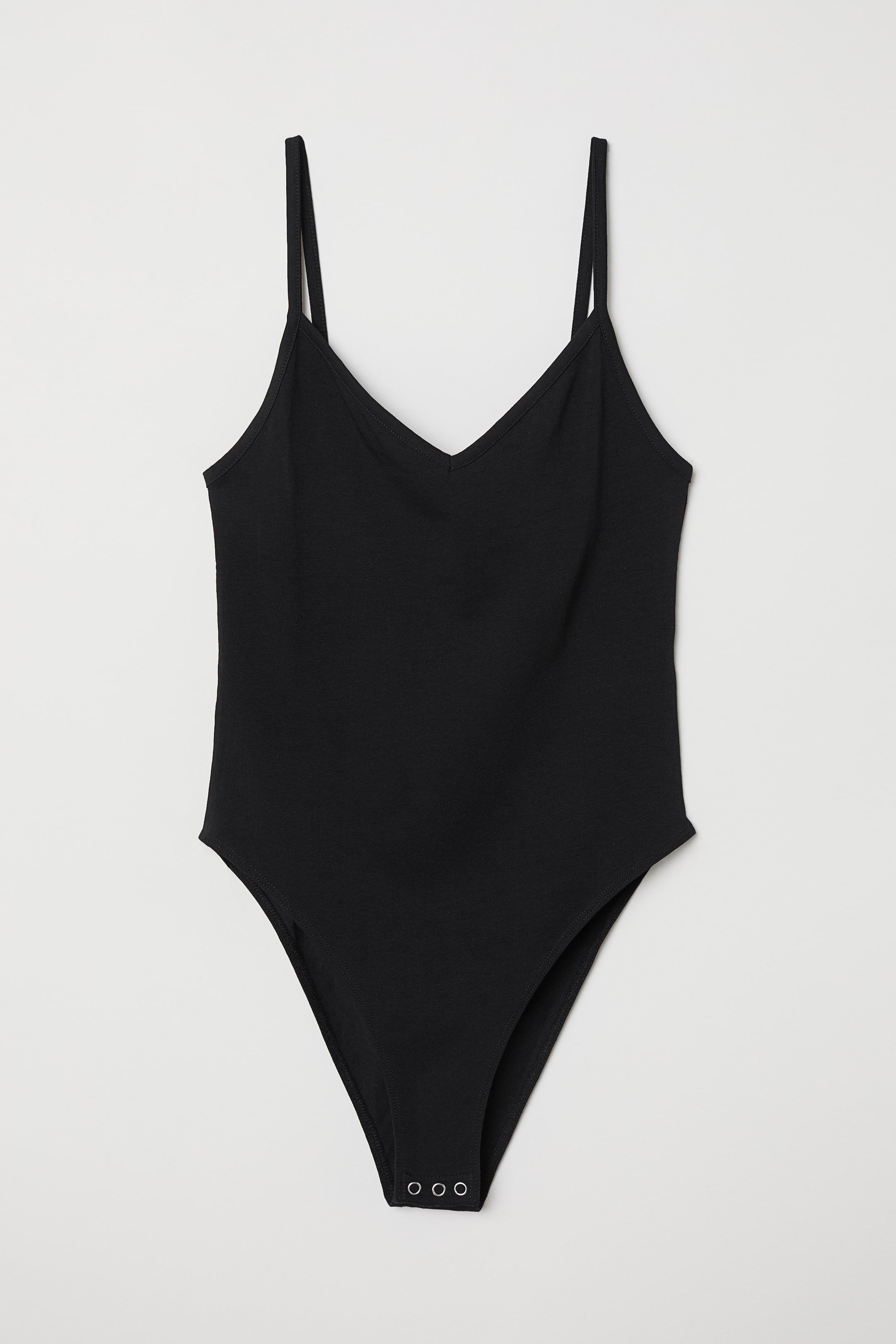 En v-ringad body i mjuk trikå. Bodyn har smala axelband och tryckknappar i grenen.