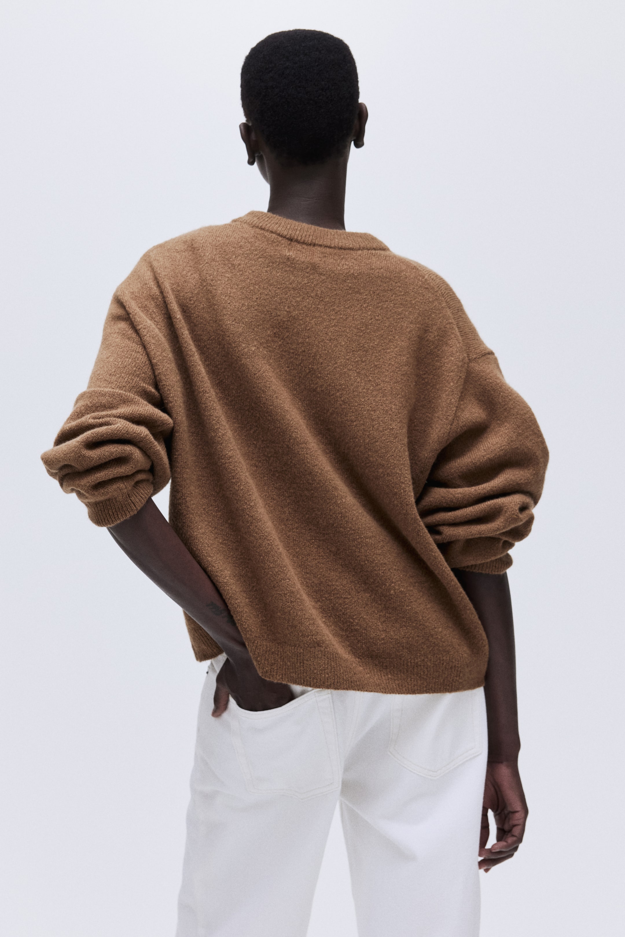 En stickad tröja i mjuk kvalitet med inslag av ull. Tröjan har rund halsringning med ribbstickad mudd, nedhasad axel och lång ärm. Ribbstickad kant vid ärmslut och nedtill.